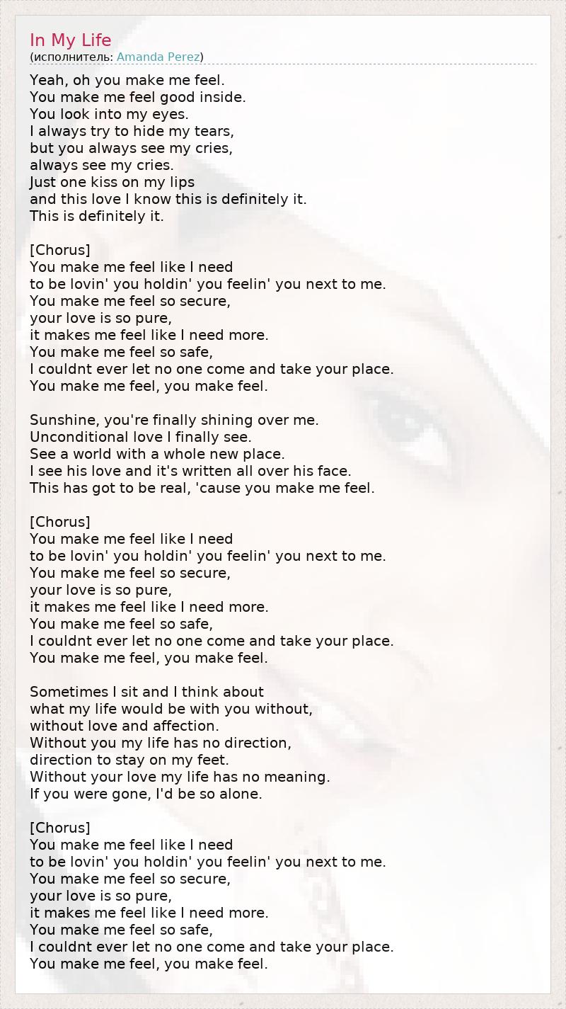 Yeah, oh you make me feel. You make me feel good inside. You look into my eyes. I always try to hide my tears, but you always see my cries, always see my cries. Just one kiss on my lips and this love I know this is definitely it. This is definitely it. [Chorus] You make me feel like I need to be lovin' you holdin' you feelin' you next to me. You make me feel so secure, your love is so pure, it makes me feel like I need more. You make me feel so safe, I couldnt ever let no one come and take your place. You make me feel, you make feel. Sunshine, you're finally shining over me. Unconditional love I finally see. See a world with a whole new place. I see his love and it's written all over his face. This has got to be real, 'cause you make me feel. [Chorus] You make me feel like I need to be lovin' you holdin' you feelin' you next to me. You make me feel so secure, your love is so pure, it makes me feel like I need more. You make me feel so safe, I couldnt ever let no one come and take your place. You make me feel, you make feel. Sometimes I sit and I think about what my life would be with you without, without love and affection. Without you my life has no direction, direction to stay on my feet. Without your love my life has no meaning. If you were gone, I'd be so alone. [Chorus] You make me feel like I need to be lovin' you holdin' you feelin' you next to me. You make me feel so secure, your love is so pure, it makes me feel like I need more. You make me feel so safe, I couldnt ever let no one come and take your place. You make me feel, you make feel.