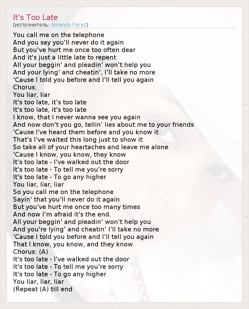 You call me on the telephone And you say you'll never do it again But you've hurt me once too often dear And it's just a little late to repent All your beggin' and pleadin' won't help you And your lying' and cheatin', I'll take no more 'Cause I told you before and I'll tell you again Chorus: You liar, liar It's too late, it's too late It's too late, it's too late I know, that I never wanna see you again And now don't you go, tellin' lies about me to your friends 'Cause I've heard them before and you know it That's I've waited this long just to show it So take all of your heartaches and leave me alone 'Cause I know, you know, they know It's too late - I've walked out the door It's too late - To tell me you're sorry It's too late - To go any higher You liar, liar, liar So you call me on the telephone Sayin' that you'll never do it again But you've hurt me once too many times And now I'm afraid it's the end. All your beggin' and pleadin' won't help you And you're lying' and cheatin' I'll take no more 'Cause I told you before and I'll tell you again That I know, you know, and they know Chorus: (A) It's too late - I've walked out the door It's too late - To tell me you're sorry It's too late - To go any higher You liar, liar, liar (Repeat (A) till end