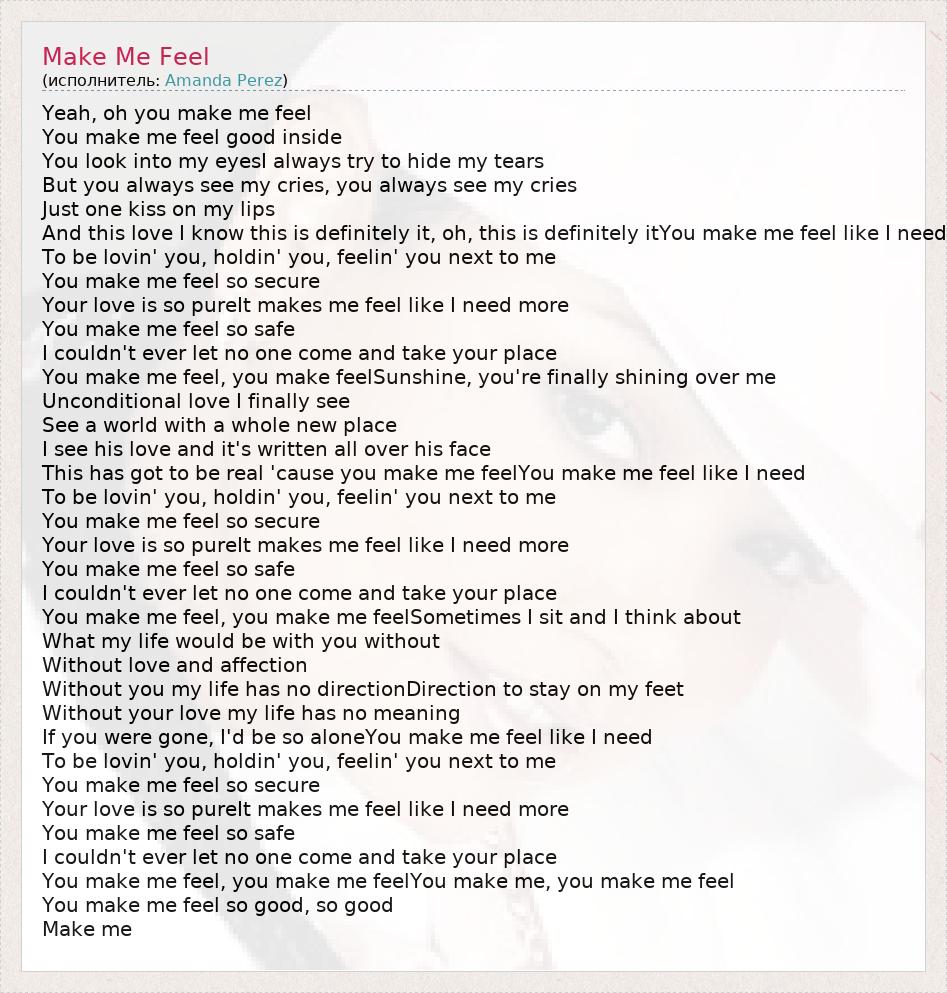 Yeah, oh you make me feel You make me feel good inside You look into my eyesI always try to hide my tears But you always see my cries, you always see my cries Just one kiss on my lips And this love I know this is definitely it, oh, this is definitely itYou make me feel like I need To be lovin' you, holdin' you, feelin' you next to me You make me feel so secure Your love is so pureIt makes me feel like I need more You make me feel so safe I couldn't ever let no one come and take your place You make me feel, you make feelSunshine, you're finally shining over me Unconditional love I finally see See a world with a whole new place I see his love and it's written all over his face This has got to be real 'cause you make me feelYou make me feel like I need To be lovin' you, holdin' you, feelin' you next to me You make me feel so secure Your love is so pureIt makes me feel like I need more You make me feel so safe I couldn't ever let no one come and take your place You make me feel, you make me feelSometimes I sit and I think about What my life would be with you without Without love and affection Without you my life has no directionDirection to stay on my feet Without your love my life has no meaning If you were gone, I'd be so aloneYou make me feel like I need To be lovin' you, holdin' you, feelin' you next to me You make me feel so secure Your love is so pureIt makes me feel like I need more You make me feel so safe I couldn't ever let no one come and take your place You make me feel, you make me feelYou make me, you make me feel You make me feel so good, so good Make me