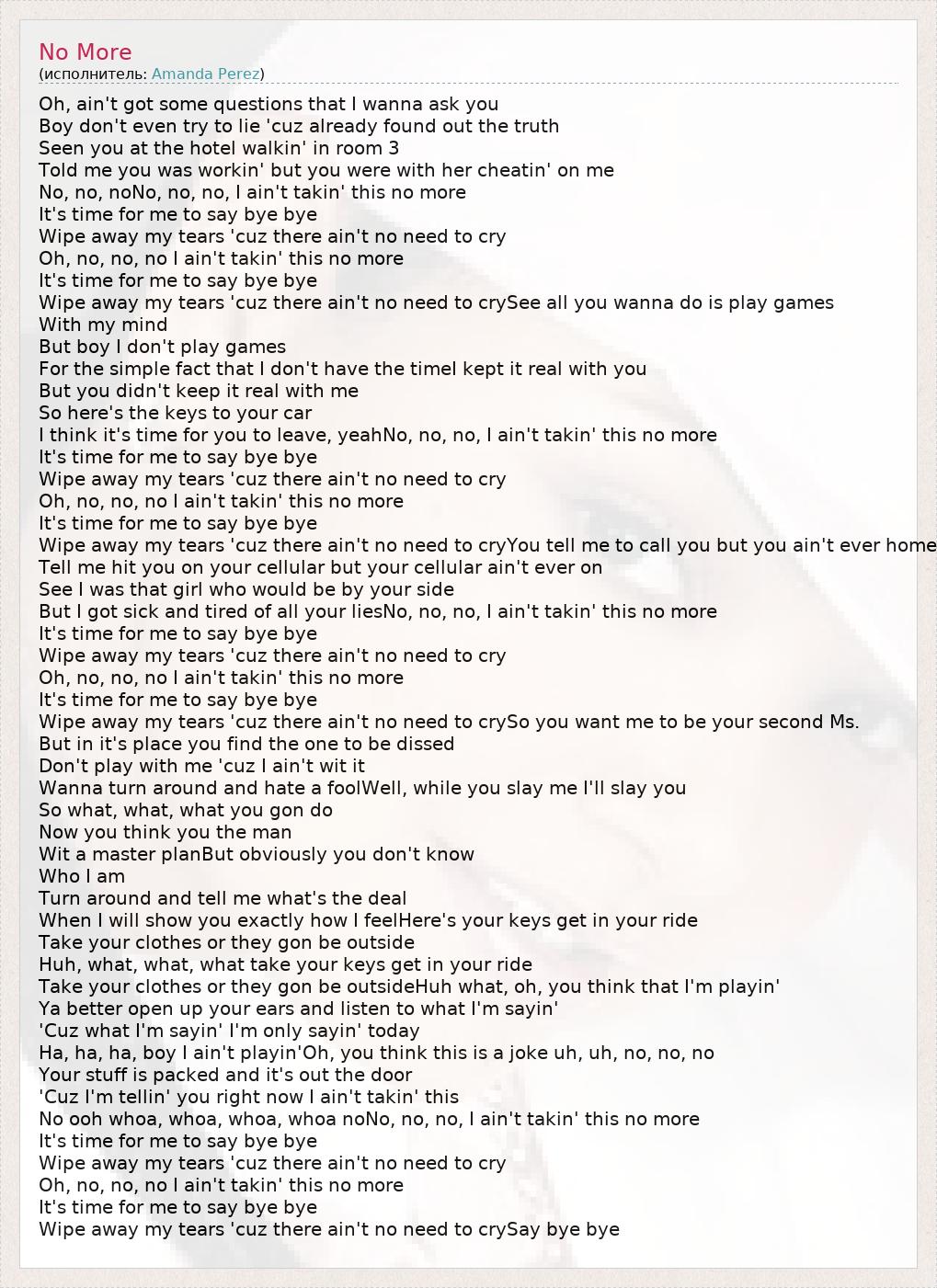 Oh, ain't got some questions that I wanna ask you Boy don't even try to lie 'cuz already found out the truth Seen you at the hotel walkin' in room 3 Told me you was workin' but you were with her cheatin' on me No, no, noNo, no, no, I ain't takin' this no more It's time for me to say bye bye Wipe away my tears 'cuz there ain't no need to cry Oh, no, no, no I ain't takin' this no more It's time for me to say bye bye Wipe away my tears 'cuz there ain't no need to crySee all you wanna do is play games With my mind But boy I don't play games For the simple fact that I don't have the timeI kept it real with you But you didn't keep it real with me So here's the keys to your car I think it's time for you to leave, yeahNo, no, no, I ain't takin' this no more It's time for me to say bye bye Wipe away my tears 'cuz there ain't no need to cry Oh, no, no, no I ain't takin' this no more It's time for me to say bye bye Wipe away my tears 'cuz there ain't no need to cryYou tell me to call you but you ain't ever home Tell me hit you on your cellular but your cellular ain't ever on See I was that girl who would be by your side But I got sick and tired of all your liesNo, no, no, I ain't takin' this no more It's time for me to say bye bye Wipe away my tears 'cuz there ain't no need to cry Oh, no, no, no I ain't takin' this no more It's time for me to say bye bye Wipe away my tears 'cuz there ain't no need to crySo you want me to be your second Ms. But in it's place you find the one to be dissed Don't play with me 'cuz I ain't wit it Wanna turn around and hate a foolWell, while you slay me I'll slay you So what, what, what you gon do Now you think you the man Wit a master planBut obviously you don't know Who I am Turn around and tell me what's the deal When I will show you exactly how I feelHere's your keys get in your ride Take your clothes or they gon be outside Huh, what, what, what take your keys get in your ride Take your clothes or they gon be outsideHuh what, oh, you think that I'm playin' Ya better open up your ears and listen to what I'm sayin' 'Cuz what I'm sayin' I'm only sayin' today Ha, ha, ha, boy I ain't playin'Oh, you think this is a joke uh, uh, no, no, no Your stuff is packed and it's out the door 'Cuz I'm tellin' you right now I ain't takin' this No ooh whoa, whoa, whoa, whoa noNo, no, no, I ain't takin' this no more It's time for me to say bye bye Wipe away my tears 'cuz there ain't no need to cry Oh, no, no, no I ain't takin' this no more It's time for me to say bye bye Wipe away my tears 'cuz there ain't no need to crySay bye bye