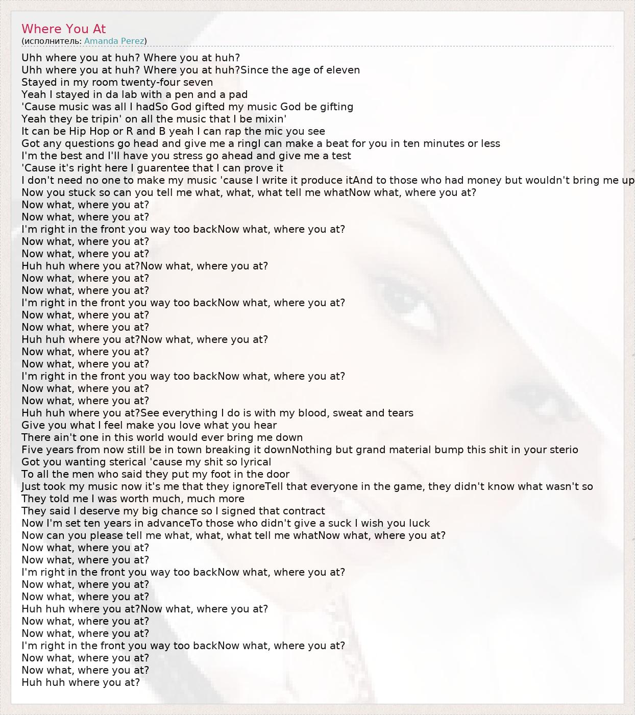 Uhh where you at huh? Where you at huh? Uhh where you at huh? Where you at huh?Since the age of eleven Stayed in my room twenty-four seven Yeah I stayed in da lab with a pen and a pad 'Cause music was all I hadSo God gifted my music God be gifting Yeah they be tripin' on all the music that I be mixin' It can be Hip Hop or R and B yeah I can rap the mic you see Got any questions go head and give me a ringI can make a beat for you in ten minutes or less I'm the best and I'll have you stress go ahead and give me a test 'Cause it's right here I guarentee that I can prove it I don't need no one to make my music 'cause I write it produce itAnd to those who had money but wouldn't bring me up Now you stuck so can you tell me what, what, what tell me whatNow what, where you at? Now what, where you at? Now what, where you at? I'm right in the front you way too backNow what, where you at? Now what, where you at? Now what, where you at? Huh huh where you at?Now what, where you at? Now what, where you at? Now what, where you at? I'm right in the front you way too backNow what, where you at? Now what, where you at? Now what, where you at? Huh huh where you at?Now what, where you at? Now what, where you at? Now what, where you at? I'm right in the front you way too backNow what, where you at? Now what, where you at? Now what, where you at? Huh huh where you at?See everything I do is with my blood, sweat and tears Give you what I feel make you love what you hear There ain't one in this world would ever bring me down Five years from now still be in town breaking it downNothing but grand material bump this shit in your sterio Got you wanting sterical 'cause my shit so lyrical To all the men who said they put my foot in the door Just took my music now it's me that they ignoreTell that everyone in the game, they didn't know what wasn't so They told me I was worth much, much more They said I deserve my big chance so I signed that contract Now I'm set ten years in advanceTo those who didn't give a suck I wish you luck Now can you please tell me what, what, what tell me whatNow what, where you at? Now what, where you at? Now what, where you at? I'm right in the front you way too backNow what, where you at? Now what, where you at? Now what, where you at? Huh huh where you at?Now what, where you at? Now what, where you at? Now what, where you at? I'm right in the front you way too backNow what, where you at? Now what, where you at? Now what, where you at? Huh huh where you at?