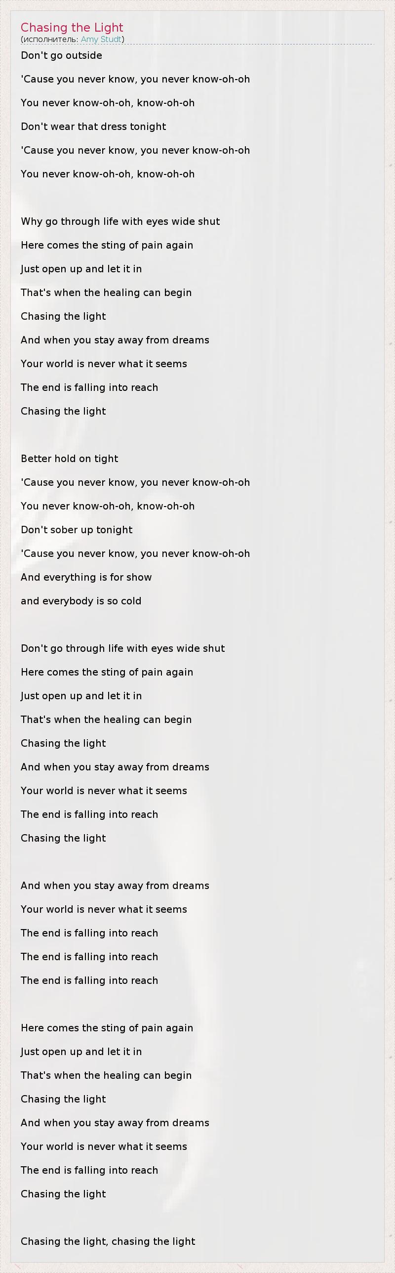 Don't go outside 'Cause you never know, you never know-oh-oh You never know-oh-oh, know-oh-oh Don't wear that dress tonight 'Cause you never know, you never know-oh-oh You never know-oh-oh, know-oh-oh Why go through life with eyes wide shut Here comes the sting of pain again Just open up and let it in That's when the healing can begin Chasing the light And when you stay away from dreams Your world is never what it seems The end is falling into reach Chasing the light Better hold on tight 'Cause you never know, you never know-oh-oh You never know-oh-oh, know-oh-oh Don't sober up tonight 'Cause you never know, you never know-oh-oh And everything is for show and everybody is so cold Don't go through life with eyes wide shut Here comes the sting of pain again Just open up and let it in That's when the healing can begin Chasing the light And when you stay away from dreams Your world is never what it seems The end is falling into reach Chasing the light And when you stay away from dreams Your world is never what it seems The end is falling into reach The end is falling into reach The end is falling into reach Here comes the sting of pain again Just open up and let it in That's when the healing can begin Chasing the light And when you stay away from dreams Your world is never what it seems The end is falling into reach Chasing the light Chasing the light, chasing the light