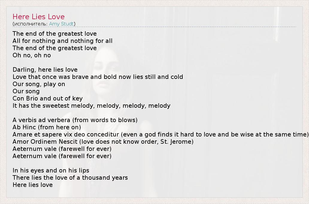 The end of the greatest love All for nothing and nothing for all The end of the greatest love Oh no, oh no Darling, here lies love Love that once was brave and bold now lies still and cold Our song, play on Our song Con Brio and out of key It has the sweetest melody, melody, melody, melody A verbis ad verbera (from words to blows) Ab Hinc (from here on) Amare et sapere vix deo conceditur (even a god finds it hard to love and be wise at the same time) Amor Ordinem Nescit (love does not know order, St. Jerome) Aeternum vale (farewell for ever) Aeternum vale (farewell for ever) In his eyes and on his lips There lies the love of a thousand years Here lies love