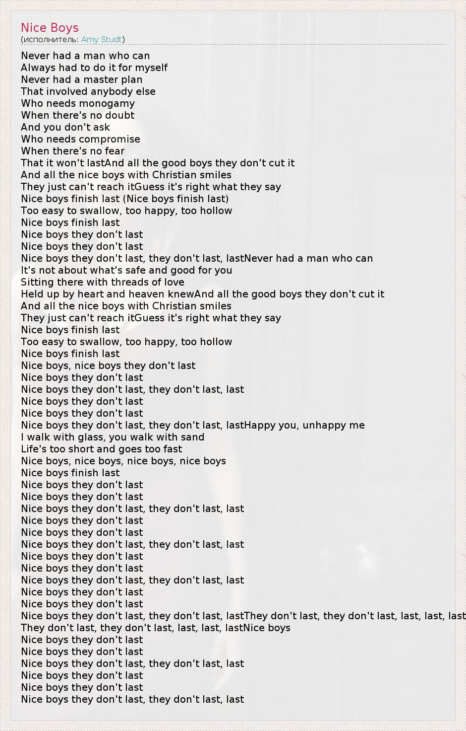 Never had a man who can Always had to do it for myself Never had a master plan That involved anybody else Who needs monogamy When there's no doubt And you don't ask Who needs compromise When there's no fear That it won't lastAnd all the good boys they don't cut it And all the nice boys with Christian smiles They just can't reach itGuess it's right what they say Nice boys finish last (Nice boys finish last) Too easy to swallow, too happy, too hollow Nice boys finish last Nice boys they don't last Nice boys they don't last Nice boys they don't last, they don't last, lastNever had a man who can It's not about what's safe and good for you Sitting there with threads of love Held up by heart and heaven knewAnd all the good boys they don't cut it And all the nice boys with Christian smiles They just can't reach itGuess it's right what they say Nice boys finish last Too easy to swallow, too happy, too hollow Nice boys finish last Nice boys, nice boys they don't last Nice boys they don't last Nice boys they don't last, they don't last, last Nice boys they don't last Nice boys they don't last Nice boys they don't last, they don't last, lastHappy you, unhappy me I walk with glass, you walk with sand Life's too short and goes too fast Nice boys, nice boys, nice boys, nice boys Nice boys finish last Nice boys they don't last Nice boys they don't last Nice boys they don't last, they don't last, last Nice boys they don't last Nice boys they don't last Nice boys they don't last, they don't last, last Nice boys they don't last Nice boys they don't last Nice boys they don't last, they don't last, last Nice boys they don't last Nice boys they don't last Nice boys they don't last, they don't last, lastThey don't last, they don't last, last, last, last They don't last, they don't last, last, last, lastNice boys Nice boys they don't last Nice boys they don't last Nice boys they don't last, they don't last, last Nice boys they don't last Nice boys they don't last Nice boys they don't last, they don't last, last