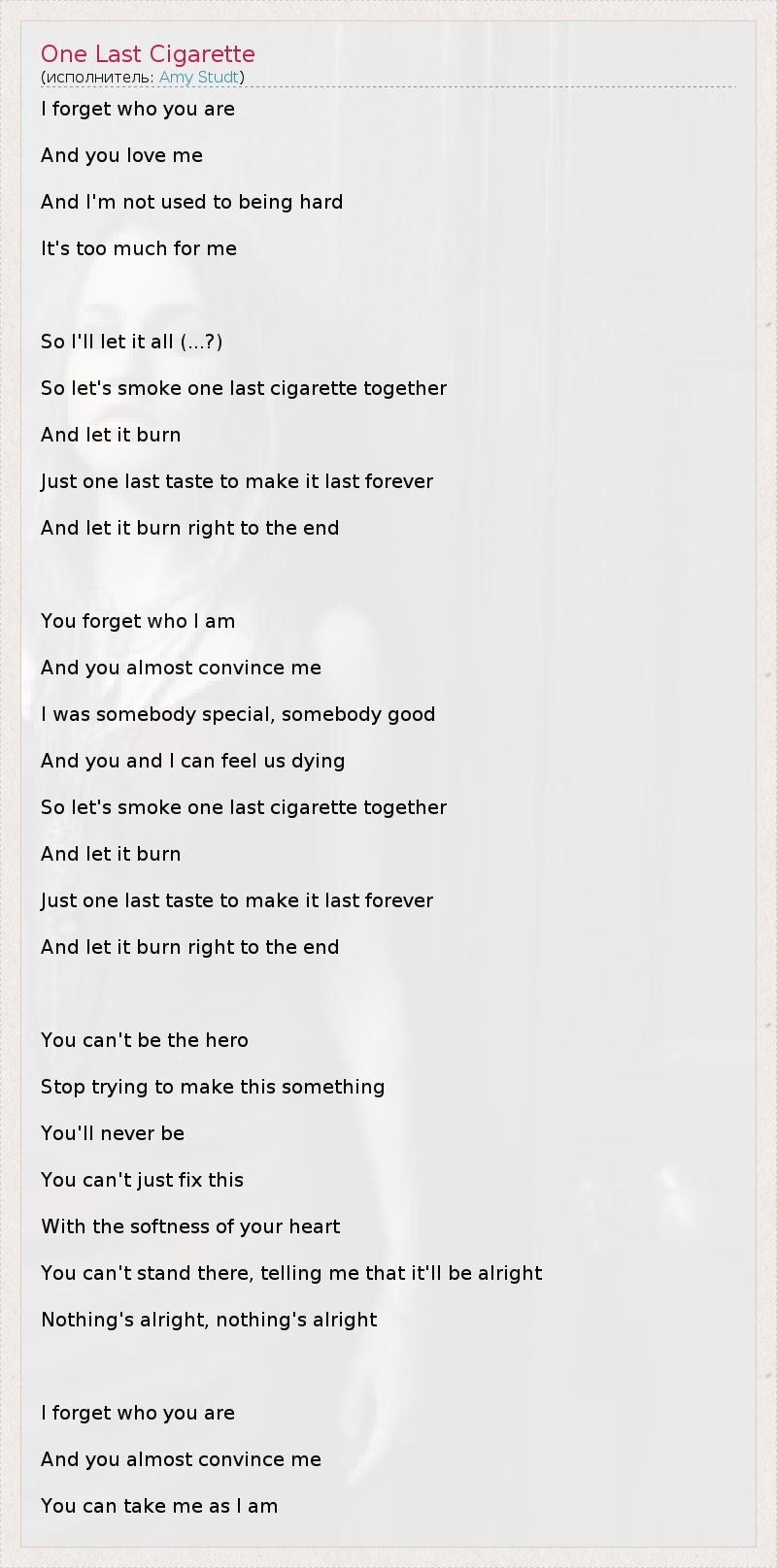 I forget who you are And you love me And I'm not used to being hard It's too much for me So I'll let it all (...?) So let's smoke one last cigarette together And let it burn Just one last taste to make it last forever And let it burn right to the end You forget who I am And you almost convince me I was somebody special, somebody good And you and I can feel us dying So let's smoke one last cigarette together And let it burn Just one last taste to make it last forever And let it burn right to the end You can't be the hero Stop trying to make this something You'll never be You can't just fix this With the softness of your heart You can't stand there, telling me that it'll be alright Nothing's alright, nothing's alright I forget who you are And you almost convince me You can take me as I am
