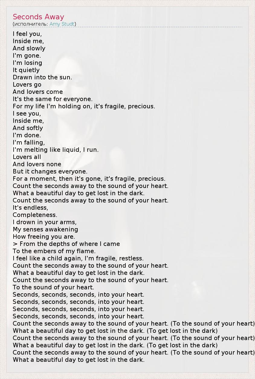 I feel you, Inside me, And slowly I'm gone. I'm losing It quietly Drawn into the sun. Lovers go And lovers come It's the same for everyone. For my life I'm holding on, it's fragile, precious. I see you, Inside me, And softly I'm done. I'm falling, I'm melting like liquid, I run. Lovers all And lovers none But it changes everyone. For a moment, then it's gone, it's fragile, precious. Count the seconds away to the sound of your heart. What a beautiful day to get lost in the dark. Count the seconds away to the sound of your heart. It's endless, Completeness. I drown in your arms, My senses awakening How freeing you are. > From the depths of where I came To the embers of my flame. I feel like a child again, I'm fragile, restless. Count the seconds away to the sound of your heart. What a beautiful day to get lost in the dark. Count the seconds away to the sound of your heart. To the sound of your heart. Seconds, seconds, seconds, into your heart. Seconds, seconds, seconds, into your heart. Seconds, seconds, seconds, into your heart. Seconds, seconds, seconds, into your heart. Count the seconds away to the sound of your heart. (To the sound of your heart) What a beautiful day to get lost in the dark. (To get lost in the dark) Count the seconds away to the sound of your heart. (To the sound of your heart) What a beautiful day to get lost in the dark. (To get lost in the dark) Count the seconds away to the sound of your heart. (To the sound of your heart) What a beautiful day to get lost in the dark.