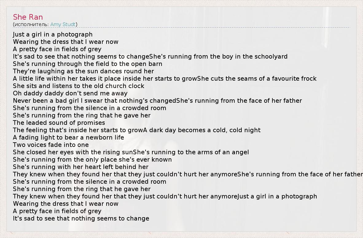 Just a girl in a photograph Wearing the dress that I wear now A pretty face in fields of grey It's sad to see that nothing seems to changeShe's running from the boy in the schoolyard She's running through the field to the open barn They're laughing as the sun dances round her A little life within her takes it place inside her starts to growShe cuts the seams of a favourite frock She sits and listens to the old church clock Oh daddy daddy don't send me away Never been a bad girl I swear that nothing's changedShe's running from the face of her father She's running from the silence in a crowded room She's running from the ring that he gave her The leaded sound of promises The feeling that's inside her starts to growA dark day becomes a cold, cold night A fading light to bear a newborn life Two voices fade into one She closed her eyes with the rising sunShe's running to the arms of an angel She's running from the only place she's ever known She's running with her heart left behind her They knew when they found her that they just couldn't hurt her anymoreShe's running from the face of her father She's running from the silence in a crowded room She's running from the ring that he gave her They knew when they found her that they just couldn't hurt her anymoreJust a girl in a photograph Wearing the dress that I wear now A pretty face in fields of grey It's sad to see that nothing seems to change