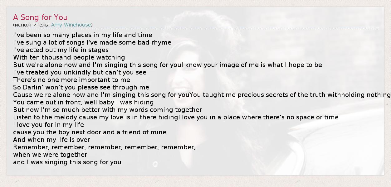 I've been so many places in my life and time I've sung a lot of songs I've made some bad rhyme I've acted out my life in stages With ten thousand people watching But we're alone now and I'm singing this song for youI know your image of me is what I hope to be I've treated you unkindly but can't you see There's no one more important to me So Darlin' won't you please see through me Cause we're alone now and I'm singing this song for youYou taught me precious secrets of the truth withholding nothing You came out in front, well baby I was hiding But now I'm so much better with my words coming together Listen to the melody cause my love is in there hidingI love you in a place where there's no space or time I love you for in my life cause you the boy next door and a friend of mine And when my life is over Remember, remember, remember, remember, remember, when we were together and I was singing this song for you