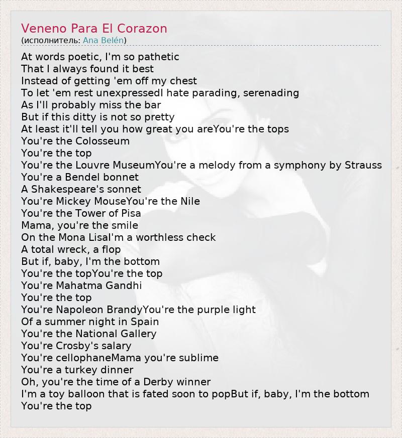 At words poetic, I'm so pathetic That I always found it best Instead of getting 'em off my chest To let 'em rest unexpressedI hate parading, serenading As I'll probably miss the bar But if this ditty is not so pretty At least it'll tell you how great you areYou're the tops You're the Colosseum You're the top You're the Louvre MuseumYou're a melody from a symphony by Strauss You're a Bendel bonnet A Shakespeare's sonnet You're Mickey MouseYou're the Nile You're the Tower of Pisa Mama, you're the smile On the Mona LisaI'm a worthless check A total wreck, a flop But if, baby, I'm the bottom You're the topYou're the top You're Mahatma Gandhi You're the top You're Napoleon BrandyYou're the purple light Of a summer night in Spain You're the National Gallery You're Crosby's salary You're cellophaneMama you're sublime You're a turkey dinner Oh, you're the time of a Derby winner I'm a toy balloon that is fated soon to popBut if, baby, I'm the bottom You're the top