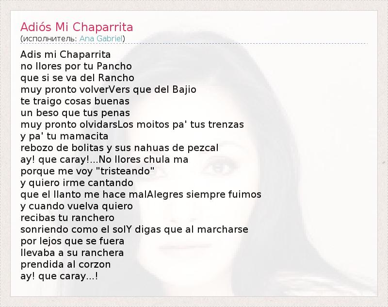 Adis mi Chaparrita no llores por tu Pancho que si se va del Rancho muy pronto volverVers que del Bajio te traigo cosas buenas un beso que tus penas muy pronto olvidarsLos moitos pa' tus trenzas y pa' tu mamacita rebozo de bolitas y sus nahuas de pezcal ay! que caray!...No llores chula ma porque me voy "tristeando" y quiero irme cantando que el llanto me hace malAlegres siempre fuimos y cuando vuelva quiero recibas tu ranchero sonriendo como el solY digas que al marcharse por lejos que se fuera llevaba a su ranchera prendida al corzon ay! que caray...!