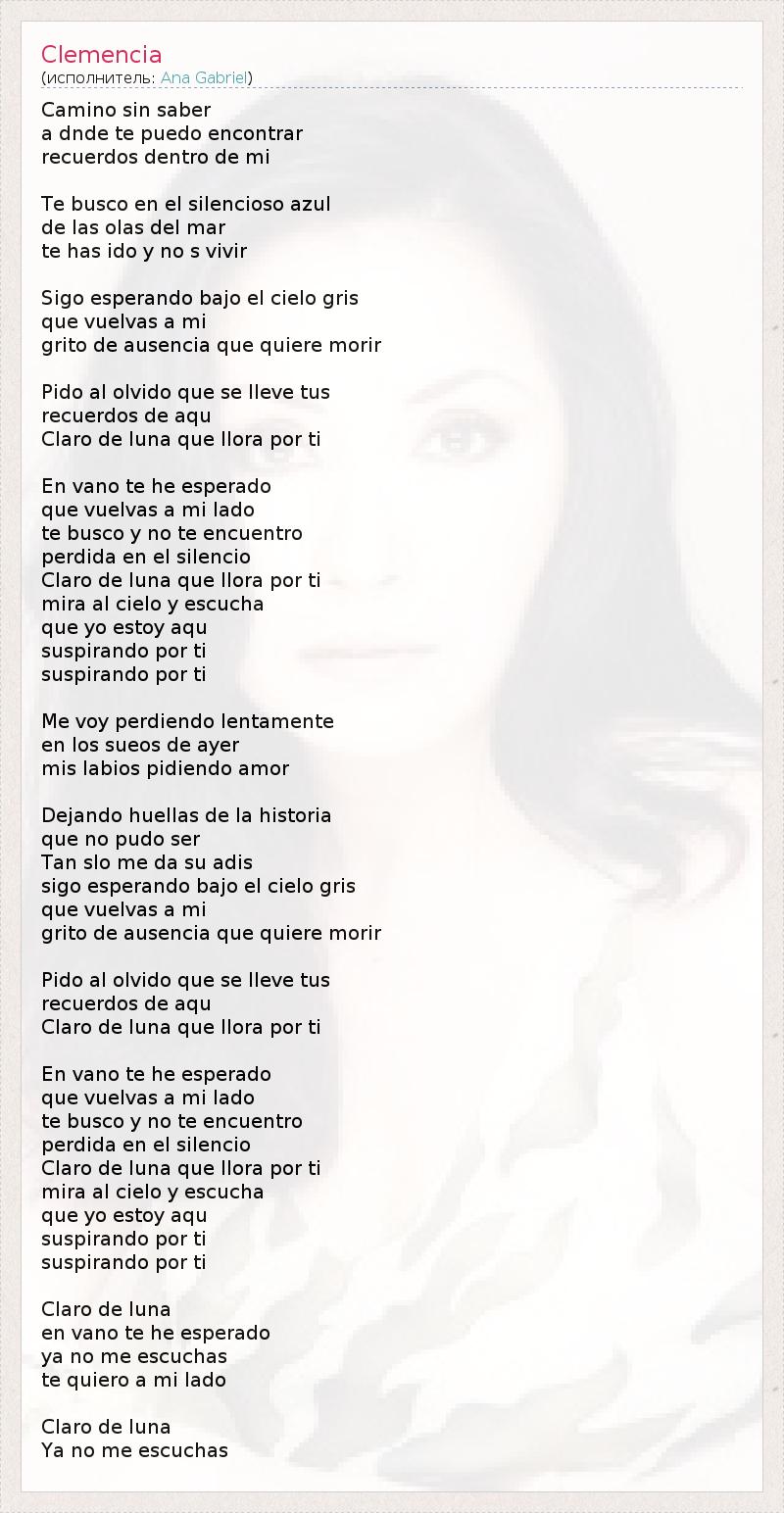 Camino sin saber a dnde te puedo encontrar recuerdos dentro de mi Te busco en el silencioso azul de las olas del mar te has ido y no s vivir Sigo esperando bajo el cielo gris que vuelvas a mi grito de ausencia que quiere morir Pido al olvido que se lleve tus recuerdos de aqu Claro de luna que llora por ti En vano te he esperado que vuelvas a mi lado te busco y no te encuentro perdida en el silencio Claro de luna que llora por ti mira al cielo y escucha que yo estoy aqu suspirando por ti suspirando por ti Me voy perdiendo lentamente en los sueos de ayer mis labios pidiendo amor Dejando huellas de la historia que no pudo ser Tan slo me da su adis sigo esperando bajo el cielo gris que vuelvas a mi grito de ausencia que quiere morir Pido al olvido que se lleve tus recuerdos de aqu Claro de luna que llora por ti En vano te he esperado que vuelvas a mi lado te busco y no te encuentro perdida en el silencio Claro de luna que llora por ti mira al cielo y escucha que yo estoy aqu suspirando por ti suspirando por ti Claro de luna en vano te he esperado ya no me escuchas te quiero a mi lado Claro de luna Ya no me escuchas
