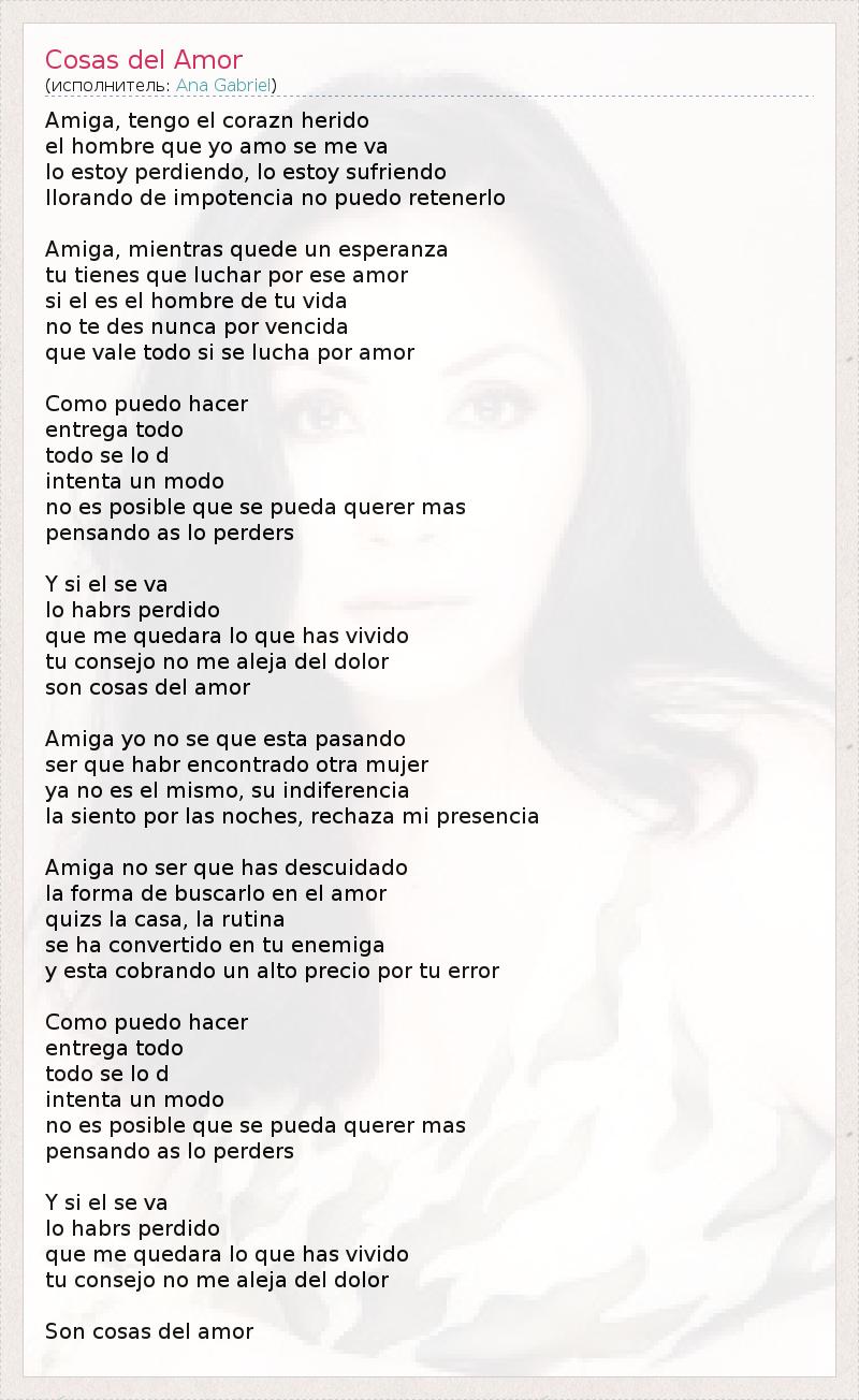 Amiga, tengo el corazn herido el hombre que yo amo se me va lo estoy perdiendo, lo estoy sufriendo llorando de impotencia no puedo retenerlo Amiga, mientras quede un esperanza tu tienes que luchar por ese amor si el es el hombre de tu vida no te des nunca por vencida que vale todo si se lucha por amor Como puedo hacer entrega todo todo se lo d intenta un modo no es posible que se pueda querer mas pensando as lo perders Y si el se va lo habrs perdido que me quedara lo que has vivido tu consejo no me aleja del dolor son cosas del amor Amiga yo no se que esta pasando ser que habr encontrado otra mujer ya no es el mismo, su indiferencia la siento por las noches, rechaza mi presencia Amiga no ser que has descuidado la forma de buscarlo en el amor quizs la casa, la rutina se ha convertido en tu enemiga y esta cobrando un alto precio por tu error Como puedo hacer entrega todo todo se lo d intenta un modo no es posible que se pueda querer mas pensando as lo perders Y si el se va lo habrs perdido que me quedara lo que has vivido tu consejo no me aleja del dolor Son cosas del amor