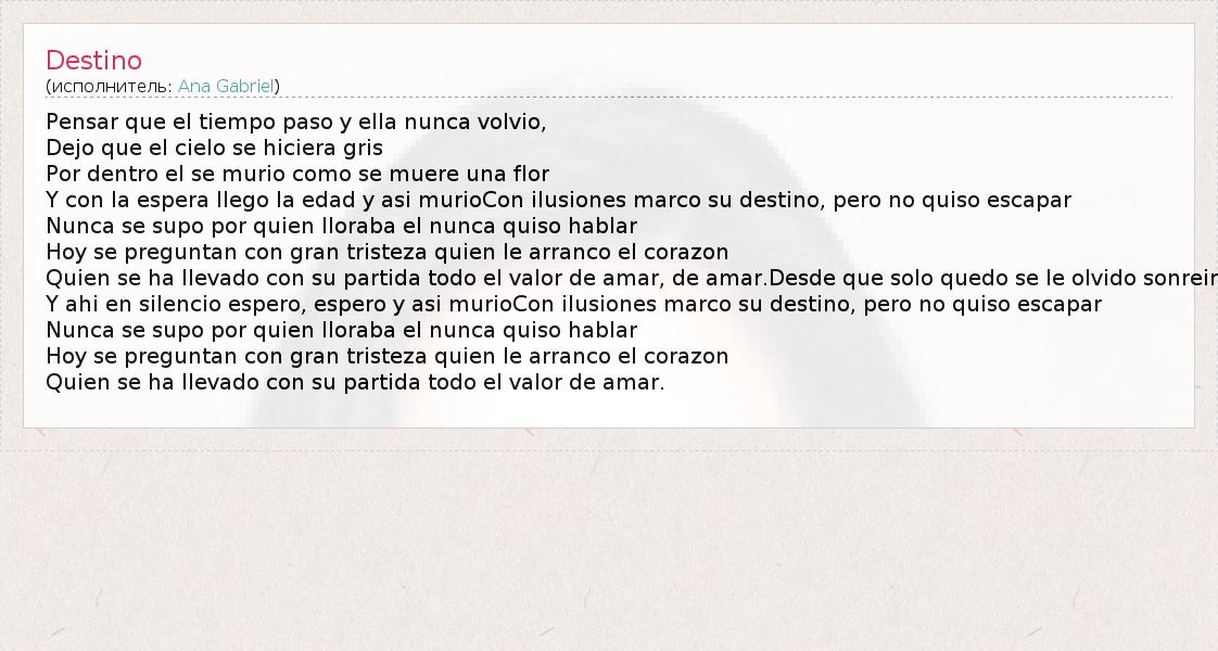 Pensar que el tiempo paso y ella nunca volvio, Dejo que el cielo se hiciera gris Por dentro el se murio como se muere una flor Y con la espera llego la edad y asi murioCon ilusiones marco su destino, pero no quiso escapar Nunca se supo por quien lloraba el nunca quiso hablar Hoy se preguntan con gran tristeza quien le arranco el corazon Quien se ha llevado con su partida todo el valor de amar, de amar.Desde que solo quedo se le olvido sonreir Y ahi en silencio espero, espero y asi murioCon ilusiones marco su destino, pero no quiso escapar Nunca se supo por quien lloraba el nunca quiso hablar Hoy se preguntan con gran tristeza quien le arranco el corazon Quien se ha llevado con su partida todo el valor de amar.