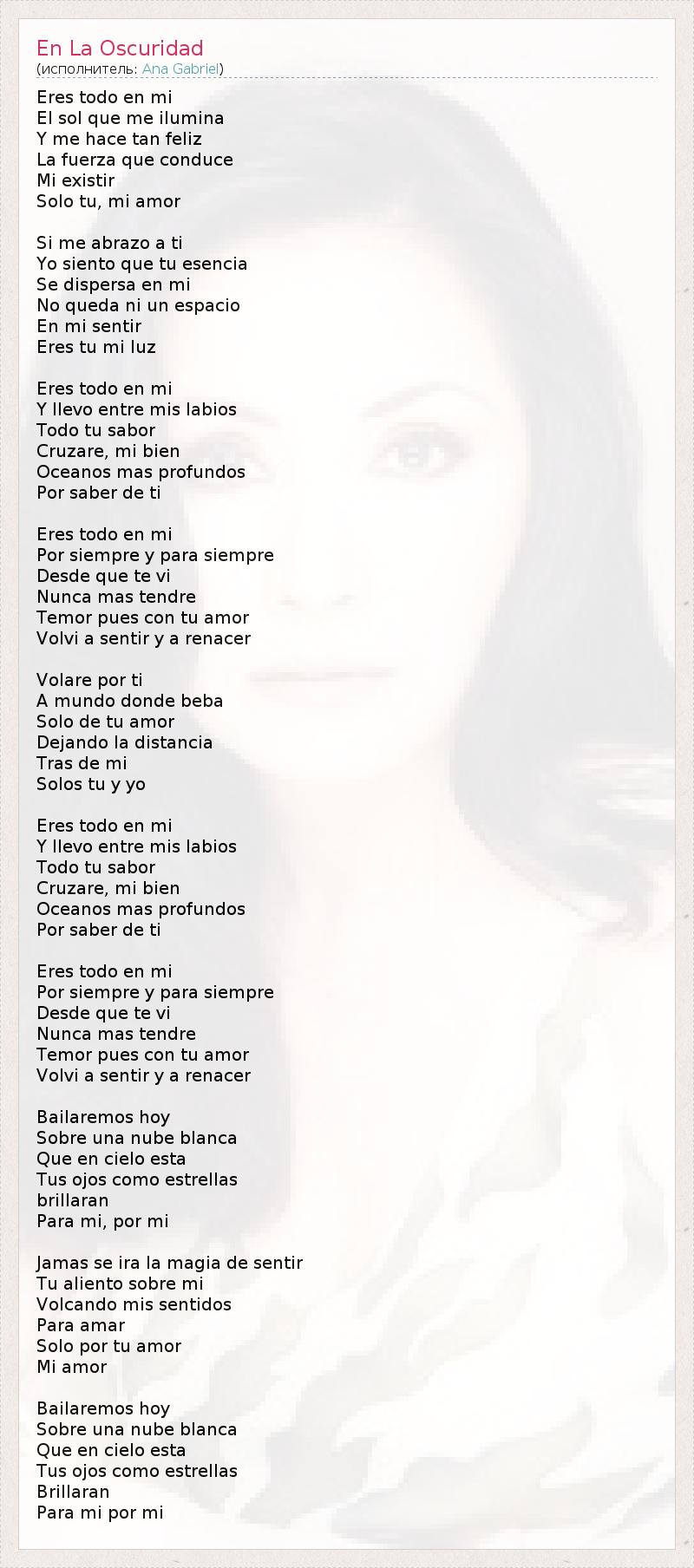 Eres todo en mi El sol que me ilumina Y me hace tan feliz La fuerza que conduce Mi existir Solo tu, mi amor Si me abrazo a ti Yo siento que tu esencia Se dispersa en mi No queda ni un espacio En mi sentir Eres tu mi luz Eres todo en mi Y llevo entre mis labios Todo tu sabor Cruzare, mi bien Oceanos mas profundos Por saber de ti Eres todo en mi Por siempre y para siempre Desde que te vi Nunca mas tendre Temor pues con tu amor Volvi a sentir y a renacer Volare por ti A mundo donde beba Solo de tu amor Dejando la distancia Tras de mi Solos tu y yo Eres todo en mi Y llevo entre mis labios Todo tu sabor Cruzare, mi bien Oceanos mas profundos Por saber de ti Eres todo en mi Por siempre y para siempre Desde que te vi Nunca mas tendre Temor pues con tu amor Volvi a sentir y a renacer Bailaremos hoy Sobre una nube blanca Que en cielo esta Tus ojos como estrellas brillaran Para mi, por mi Jamas se ira la magia de sentir Tu aliento sobre mi Volcando mis sentidos Para amar Solo por tu amor Mi amor Bailaremos hoy Sobre una nube blanca Que en cielo esta Tus ojos como estrellas Brillaran Para mi por mi