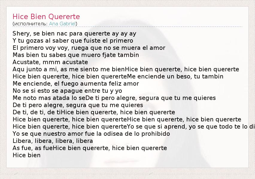 Shery, se bien nac para quererte ay ay ay Y tu gozas al saber que fuiste el primero El primero voy voy, ruega que no se muera el amor Mas bien tu sabes que muero fjate tambin Acustate, mmm acustate Aqu junto a mi, as me siento me bienHice bien quererte, hice bien quererte Hice bien quererte, hice bien quererteMe enciende un beso, tu tambin Me enciende, el fuego aumenta feliz amor No se si esto se apague entre tu y yo Me noto mas atada lo seDe ti pero alegre, segura que tu me quieres De ti pero alegre, segura que tu me quieres De ti, de ti, de tiHice bien quererte, hice bien quererte Hice bien quererte, hice bien quererteHice bien quererte, hice bien quererte Hice bien quererte, hice bien quererteYo se que si aprend, yo se que todo te lo di Yo se que nuestro amor fue la odisea de lo prohibido Libera, libera, libera, libera As fue, as fueHice bien quererte, hice bien quererte Hice bien