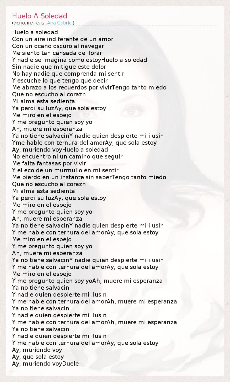Huelo a soledad Con un aire indiferente de un amor Con un ocano oscuro al navegar Me siento tan cansada de llorar Y nadie se imagina como estoyHuelo a soledad Sin nadie que mitigue este dolor No hay nadie que comprenda mi sentir Y escuche lo que tengo que decir Me abrazo a los recuerdos por vivirTengo tanto miedo Que no escucho al corazn Mi alma esta sedienta Ya perdi su luzAy, que sola estoy Me miro en el espejo Y me pregunto quien soy yo Ah, muere mi esperanza Ya no tiene salvacinY nadie quien despierte mi ilusin Yme hable con ternura del amorAy, que sola estoy Ay, muriendo voyHuelo a soledad No encuentro ni un camino que seguir Me falta fantasas por vivir Y el eco de un murmullo en mi sentir Me pierdo en un instante sin saberTengo tanto miedo Que no escucho al corazn Mi alma esta sedienta Ya perdi su luzAy, que sola estoy Me miro en el espejo Y me pregunto quien soy yo Ah, muere mi esperanza Ya no tiene salvacinY nadie quien despierte mi ilusin Y me hable con ternura del amorAy, que sola estoy Me miro en el espejo Y me pregunto quien soy yo Ah, muere mi esperanza Ya no tiene salvacinY nadie quien despierte mi ilusin Y me hable con ternura del amorAy, que sola estoy Me miro en el espejo Y me pregunto quien soy yoAh, muere mi esperanza Ya no tiene salvacin Y nadie quien despierte mi ilusin Y me hable con ternura del amorAh, muere mi esperanza Ya no tiene salvacin Y nadie quien despierte mi ilusin Y me hable con ternura del amorAh, muere mi esperanza Ya no tiene salvacin Y nadie quien despierte mi ilusin Y me hable con ternura del amorAy, que sola estoy Ay, muriendo voy Ay, que sola estoy Ay, muriendo voyDuele