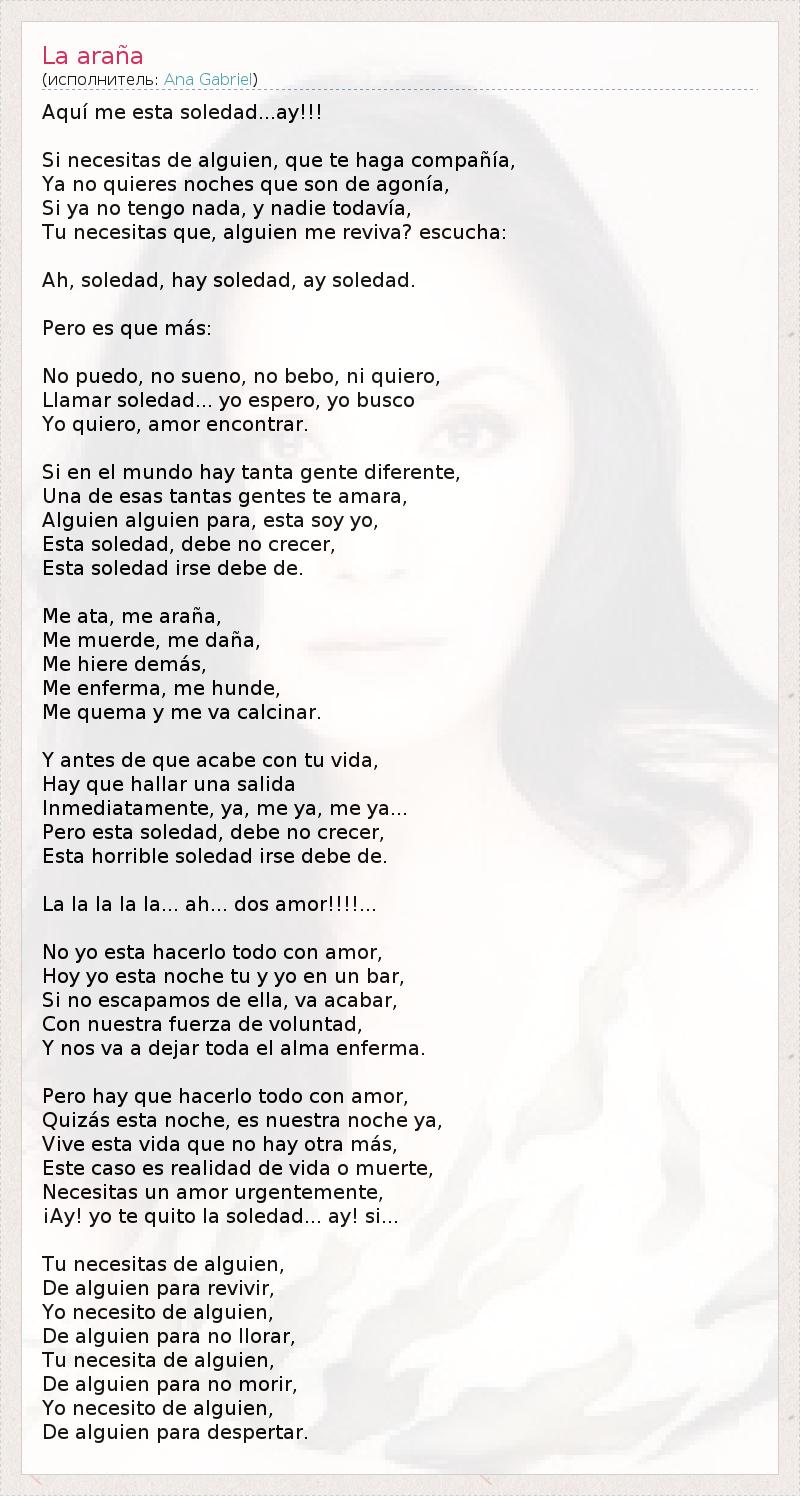 Я здесь в одиночестве... ай!!! Если тебе нужен кто-то для компании, Уже не хочешь ночи в агонии, Да, у меня нет ничего, и всё ещё никого, Тебе нужно, чтобы кто-то оживил меня? послушай: Ах, одиночество, ай, одиночество, ай, одиночество. Но дело в том, что больше: Не могу, не мечтаю, не пью, не люблю, Это называется одиночество.. я надеюсь, я ищу, Я хочу любовь найти. Если в мире есть столько разных людей, Один из них тебя полюбит, Кто-то, кто-то есть и для меня, Это одиночество не должно расти, Это одиночество должно уйти. Меня связывает, меня царапает, Меня кусает, мне причиняет боль, Меня ранит, кроме всего прочего, Меня ослабляет, меня разрушает, Меня обжигает и постепенно сжигает. И пока я не покончила со своей жизнью, Нужно найти выход Немедленно, или, или я, я уже... Но это одиночество не должно расти, Это ужасное одиночество должно уйти. Ла ла ла ла ла... ах... любовь!!!!... Уже пора сделать что-то для любви, Сегодня ночью ты и я в баре, Если мы убежим от неё, Нам останется только сила воли И больная душа. Но нужно сделать всё для любви, Возможно, эта ночь - наша ночь, Живи эту жизнь так, как будто не будет другой, Ты будешь либо жить, либо умирать, Тебе срочно нужна любовь, Ай! Я оставляю тебя, одиночество... Ай! да... Тебе нужен кто-то, Кто-то, чтобы снова жить, Мне нужен кто-то, Кто-то, чтобы не плакать, Тебе нужен кто-то, Кто-то, чтобы не умереть, Мне нужен кто-то, Кто-то, чтобы проснуться.