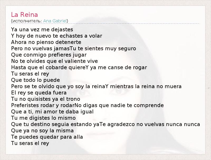 Ya una vez me dejastes Y hoy de nuevo te echastes a volar Ahora no pienso detenerte Pero no vuelvas jamasTu te sientes muy seguro Que conmigo prefieres jugar No te olvides que el valiente vive Hasta que el cobarde quiereY ya me canse de rogar Tu seras el rey Que todo lo puede Pero se te olvido que yo soy la reinaY mientras la reina no muera El rey se queda fuera Tu no quisistes ya el trono Preferistes rodar y rodarNo digas que nadie te comprende Que a ti, mi amor te daba igual Tu me digistes lo mismo Que tu destino seguia estando yaTe agradezco no vuelvas nunca nunca Que ya no soy la misma Te puedes quedar para alla Tu seras el rey