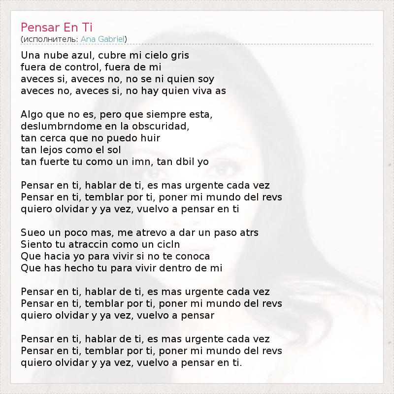 Una nube azul, cubre mi cielo gris fuera de control, fuera de mi aveces si, aveces no, no se ni quien soy aveces no, aveces si, no hay quien viva as Algo que no es, pero que siempre esta, deslumbrndome en la obscuridad, tan cerca que no puedo huir tan lejos como el sol tan fuerte tu como un imn, tan dbil yo Pensar en ti, hablar de ti, es mas urgente cada vez Pensar en ti, temblar por ti, poner mi mundo del revs quiero olvidar y ya vez, vuelvo a pensar en ti Sueo un poco mas, me atrevo a dar un paso atrs Siento tu atraccin como un cicln Que hacia yo para vivir si no te conoca Que has hecho tu para vivir dentro de mi Pensar en ti, hablar de ti, es mas urgente cada vez Pensar en ti, temblar por ti, poner mi mundo del revs quiero olvidar y ya vez, vuelvo a pensar Pensar en ti, hablar de ti, es mas urgente cada vez Pensar en ti, temblar por ti, poner mi mundo del revs quiero olvidar y ya vez, vuelvo a pensar en ti.