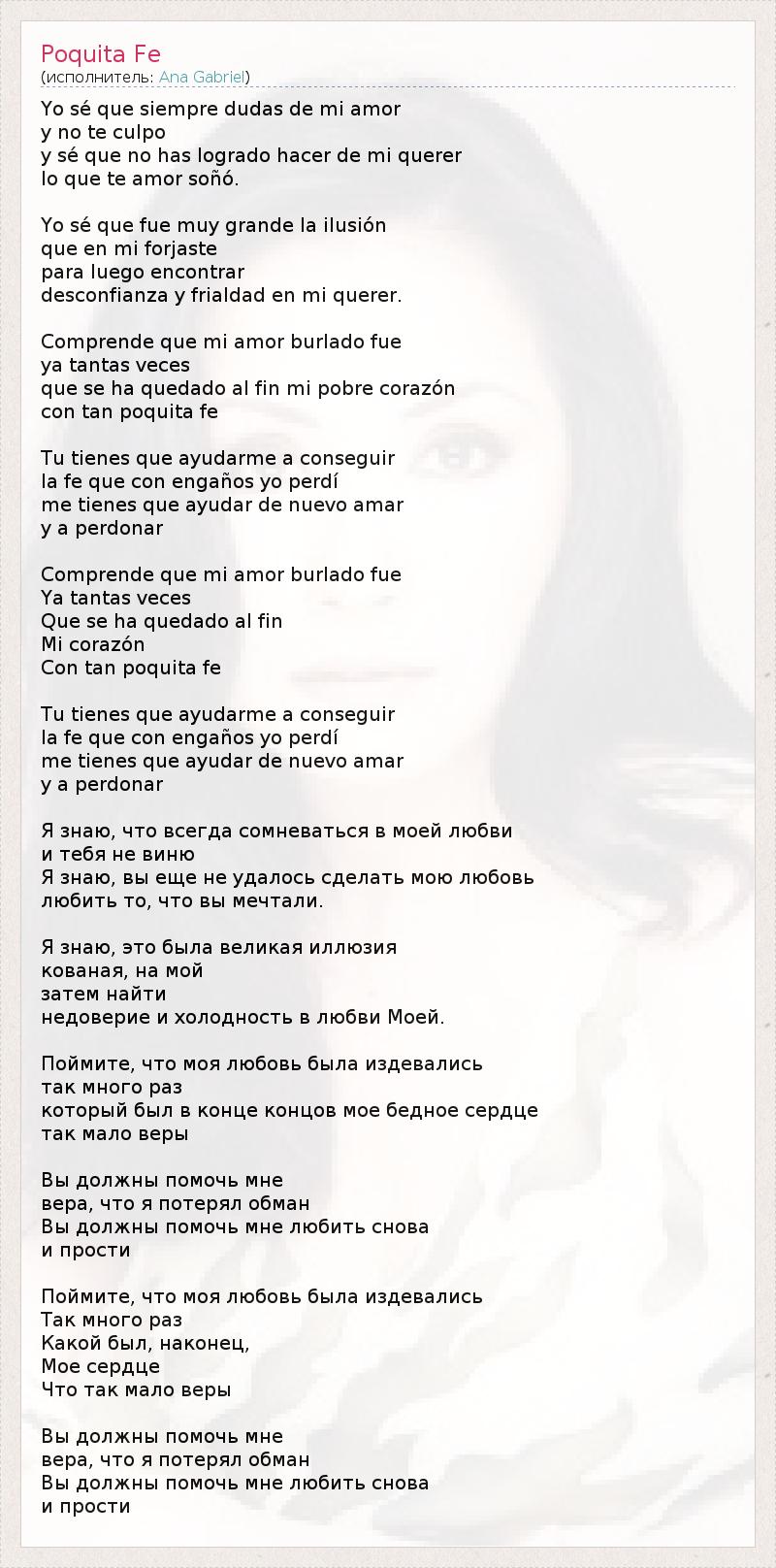 Йо Се Que Siempre Dudas де Mi Amor у нет те culpo не у Се Que не имеет logrado Хаджер де миль querer вот Que те Amor Sono. Йо Се Que ФРУ Muy Grande ла Ilusion Que ан миль forjaste пункт Luego encontrar desconfianza у frialdad ан миль querer. Comprende Que Mi Amor burlado ФРУ я tantas VECES Que SE га quedado аль плавник миль Pobre corazón кон загар poquita Fe Ту Tienes Que ayudarme conseguir ла Фе Que кон engaños йо perdí мне Tienes Que ayudar де Нуэво Амар у perdonar Comprende Que Mi Amor burlado ФРУ Я. tantas VECES Que SE га quedado аль плавник Ми corazón Кон загар poquita Fe Ту Tienes Que ayudarme conseguir ла Фе Que кон engaños йо perdí мне Tienes Que ayudar де Нуэво Амар у perdonar Я знаю, что всегда сомневаться в моей любви и тебя не виню Я знаю, вы еще не удалось сделать мою любовь любить то, что вы мечтали. Я знаю, это была великая иллюзия кованая, на мой затем найти недоверие и холодность в любви Моей. Поймите, что моя любовь была издевались так много раз который был в конце концов мое бедное сердце так мало веры Вы должны помочь мне вера, что я потерял обман Вы должны помочь мне любить снова и прости Поймите, что моя любовь была издевались Так много раз Какой был, наконец, Мое сердце Что так мало веры Вы должны помочь мне вера, что я потерял обман Вы должны помочь мне любить снова и прости
