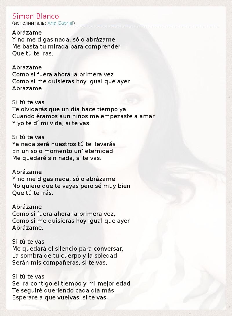 Abrázame Y no me digas nada, sólo abrázame Me basta tu mirada para comprender Que tú te iras. Abrázame Como si fuera ahora la primera vez Como si me quisieras hoy igual que ayer Abrázame. Si tú te vas Te olvidarás que un día hace tiempo ya Cuando éramos aun niños me empezaste a amar Y yo te dí mi vida, si te vas. Si tú te vas Ya nada será nuestros tú te llevarás En un solo momento un' eternidad Me quedaré sin nada, si te vas. Abrázame Y no me digas nada, sólo abrázame No quiero que te vayas pero sé muy bien Que tú te irás. Abrázame Como si fuera ahora la primera vez, Como si me quisieras hoy igual que ayer Abrázame. Si tú te vas Me quedará el silencio para conversar, La sombra de tu cuerpo y la soledad Serán mis compañerаs, si te vas. Si tú te vas Se irá contigo el tiempo y mi mejor edad Te seguiré queriendo cada día más Esperaré a que vuelvas, si te vas.