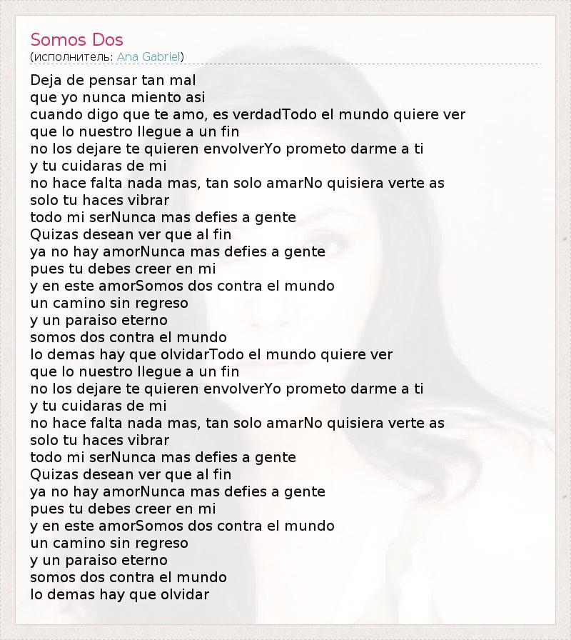 Deja de pensar tan mal que yo nunca miento asi cuando digo que te amo, es verdadTodo el mundo quiere ver que lo nuestro llegue a un fin no los dejare te quieren envolverYo prometo darme a ti y tu cuidaras de mi no hace falta nada mas, tan solo amarNo quisiera verte as solo tu haces vibrar todo mi serNunca mas defies a gente Quizas desean ver que al fin ya no hay amorNunca mas defies a gente pues tu debes creer en mi y en este amorSomos dos contra el mundo un camino sin regreso y un paraiso eterno somos dos contra el mundo lo demas hay que olvidarTodo el mundo quiere ver que lo nuestro llegue a un fin no los dejare te quieren envolverYo prometo darme a ti y tu cuidaras de mi no hace falta nada mas, tan solo amarNo quisiera verte as solo tu haces vibrar todo mi serNunca mas defies a gente Quizas desean ver que al fin ya no hay amorNunca mas defies a gente pues tu debes creer en mi y en este amorSomos dos contra el mundo un camino sin regreso y un paraiso eterno somos dos contra el mundo lo demas hay que olvidar