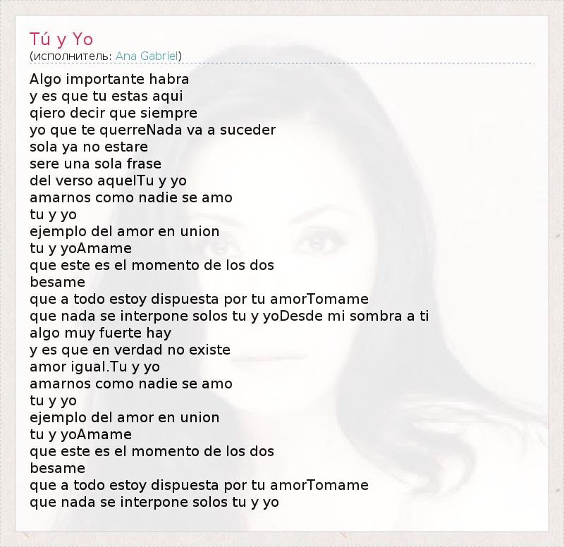 Algo importante habra y es que tu estas aqui qiero decir que siempre yo que te querreNada va a suceder sola ya no estare sere una sola frase del verso aquelTu y yo amarnos como nadie se amo tu y yo ejemplo del amor en union tu y yoAmame que este es el momento de los dos besame que a todo estoy dispuesta por tu amorTomame que nada se interpone solos tu y yoDesde mi sombra a ti algo muy fuerte hay y es que en verdad no existe amor igual.Tu y yo amarnos como nadie se amo tu y yo ejemplo del amor en union tu y yoAmame que este es el momento de los dos besame que a todo estoy dispuesta por tu amorTomame que nada se interpone solos tu y yo