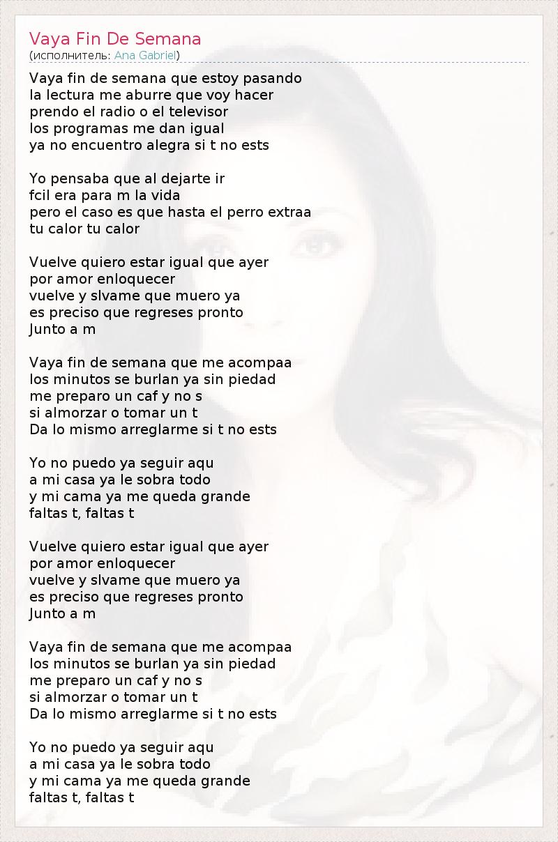 Vaya fin de semana que estoy pasando la lectura me aburre que voy hacer prendo el radio o el televisor los programas me dan igual ya no encuentro alegra si t no ests Yo pensaba que al dejarte ir fcil era para m la vida pero el caso es que hasta el perro extraa tu calor tu calor Vuelve quiero estar igual que ayer por amor enloquecer vuelve y slvame que muero ya es preciso que regreses pronto Junto a m Vaya fin de semana que me acompaa los minutos se burlan ya sin piedad me preparo un caf y no s si almorzar o tomar un t Da lo mismo arreglarme si t no ests Yo no puedo ya seguir aqu a mi casa ya le sobra todo y mi cama ya me queda grande faltas t, faltas t Vuelve quiero estar igual que ayer por amor enloquecer vuelve y slvame que muero ya es preciso que regreses pronto Junto a m Vaya fin de semana que me acompaa los minutos se burlan ya sin piedad me preparo un caf y no s si almorzar o tomar un t Da lo mismo arreglarme si t no ests Yo no puedo ya seguir aqu a mi casa ya le sobra todo y mi cama ya me queda grande faltas t, faltas t