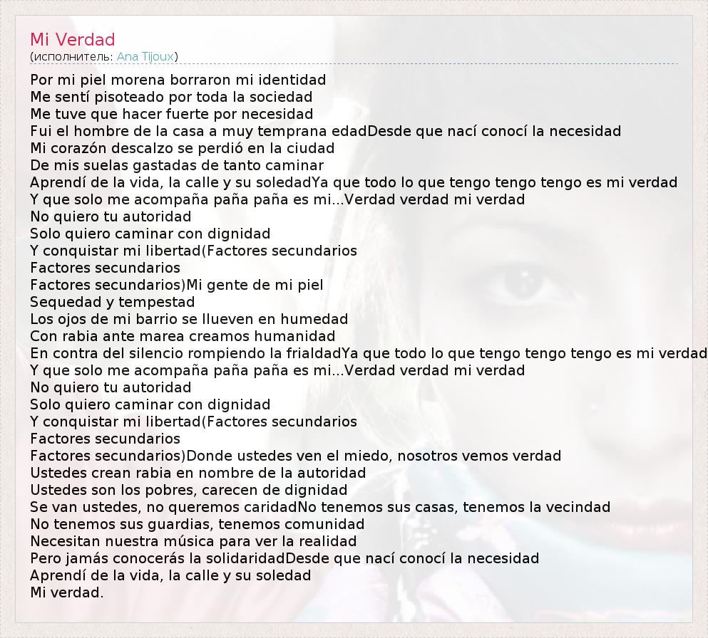 Por mi piel morena borraron mi identidad Me sentí pisoteado por toda la sociedad Me tuve que hacer fuerte por necesidad Fui el hombre de la casa a muy temprana edadDesde que nací conocí la necesidad Mi corazón descalzo se perdió en la ciudad De mis suelas gastadas de tanto caminar Aprendí de la vida, la calle y su soledadYa que todo lo que tengo tengo tengo es mi verdad Y que solo me acompaña paña paña es mi...Verdad verdad mi verdad No quiero tu autoridad Solo quiero caminar con dignidad Y conquistar mi libertad(Factores secundarios Factores secundarios Factores secundarios)Mi gente de mi piel Sequedad y tempestad Los ojos de mi barrio se llueven en humedad Con rabia ante marea creamos humanidad En contra del silencio rompiendo la frialdadYa que todo lo que tengo tengo tengo es mi verdad Y que solo me acompaña paña paña es mi...Verdad verdad mi verdad No quiero tu autoridad Solo quiero caminar con dignidad Y conquistar mi libertad(Factores secundarios Factores secundarios Factores secundarios)Donde ustedes ven el miedo, nosotros vemos verdad Ustedes crean rabia en nombre de la autoridad Ustedes son los pobres, carecen de dignidad Se van ustedes, no queremos caridadNo tenemos sus casas, tenemos la vecindad No tenemos sus guardias, tenemos comunidad Necesitan nuestra música para ver la realidad Pero jamás conocerás la solidaridadDesde que nací conocí la necesidad Aprendí de la vida, la calle y su soledad Mi verdad.