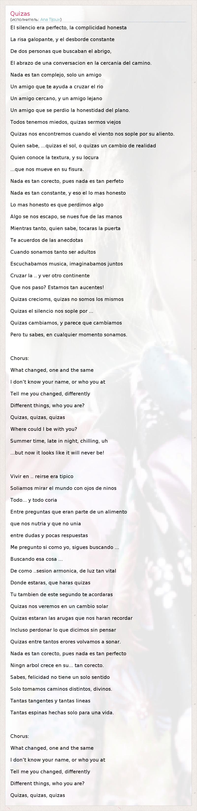 El silencio era perfecto, la complicidad honesta La risa galopante, y el desborde constante De dos personas que buscaban el abrigo, El abrazo de una conversacion en la cercania del camino. Nada es tan complejo, solo un amigo Un amigo que te ayuda a cruzar el rio Un amigo cercano, y un amigo lejano Un amigo que se perdio la honestidad del plano. Todos tenemos miedos, quizas sermos viejos Quizas nos encontremos cuando el viento nos sople por su aliento. Quien sabe, ...quizas el sol, o quizas un cambio de realidad Quien conoce la textura, y su locura ...que nos mueve en su fisura. Nada es tan corecto, pues nada es tan perfeto Nada es tan constante, y eso el lo mas honesto Lo mas honesto es que perdimos algo Algo se nos escapo, se nues fue de las manos Mientras tanto, quien sabe, tocaras la puerta Te acuerdos de las anecdotas Cuando sonamos tanto ser adultos Escuchabamos musica, imaginabamos juntos Cruzar la .. y ver otro continente Que nos paso? Estamos tan aucentes! Quizas crecioms, quizas no somos los mismos Quizas el silencio nos sople por ... Quizas cambiamos, y parece que cambiamos Pero tu sabes, en cualquier momento sonamos. Chorus: What changed, one and the same I don't know your name, or who you at Tell me you changed, differently Different things, who you are? Quizas, quizas, quizas Where could I be with you? Summer time, late in night, chilling, uh ...but now it looks like it will never be! Vivir en .. reirse era tipico Soliamos mirar el mundo con ojos de ninos Todo... y todo coria Entre preguntas que eran parte de un alimento que nos nutria y que no unia entre dudas y pocas respuestas Me pregunto si como yo, sigues buscando ... Buscando esa cosa ... De como ..sesion armonica, de luz tan vital Donde estaras, que haras quizas Tu tambien de este segundo te acordaras Quizas nos veremos en un cambio solar Quizas estaran las arugas que nos haran recordar Incluso perdonar lo que dicimos sin pensar Quizas entre tantos erores volvamos a sonar. Nada es tan corecto, pues nada es tan perfecto Ningn arbol crece en su... tan corecto. Sabes, felicidad no tiene un solo sentido Solo tomamos caminos distintos, divinos. Tantas tangentes y tantas lineas Tantas espinas hechas solo para una vida. Chorus: What changed, one and the same I don't know your name, or who you at Tell me you changed, differently Different things, who you are? Quizas, quizas, quizas