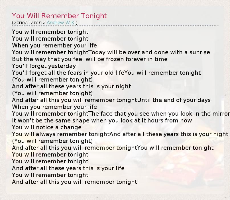 А как ты думаешь, о чем песня "You Will Remember Tonight" ?