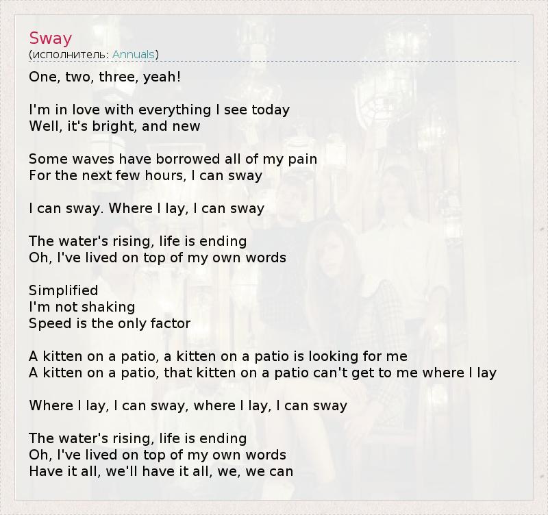 One, two, three, yeah! I'm in love with everything I see today Well, it's bright, and new Some waves have borrowed all of my pain For the next few hours, I can sway I can sway. Where I lay, I can sway The water's rising, life is ending Oh, I've lived on top of my own words Simplified I'm not shaking Speed is the only factor A kitten on a patio, a kitten on a patio is looking for me A kitten on a patio, that kitten on a patio can't get to me where I lay Where I lay, I can sway, where I lay, I can sway The water's rising, life is ending Oh, I've lived on top of my own words Have it all, we'll have it all, we, we can