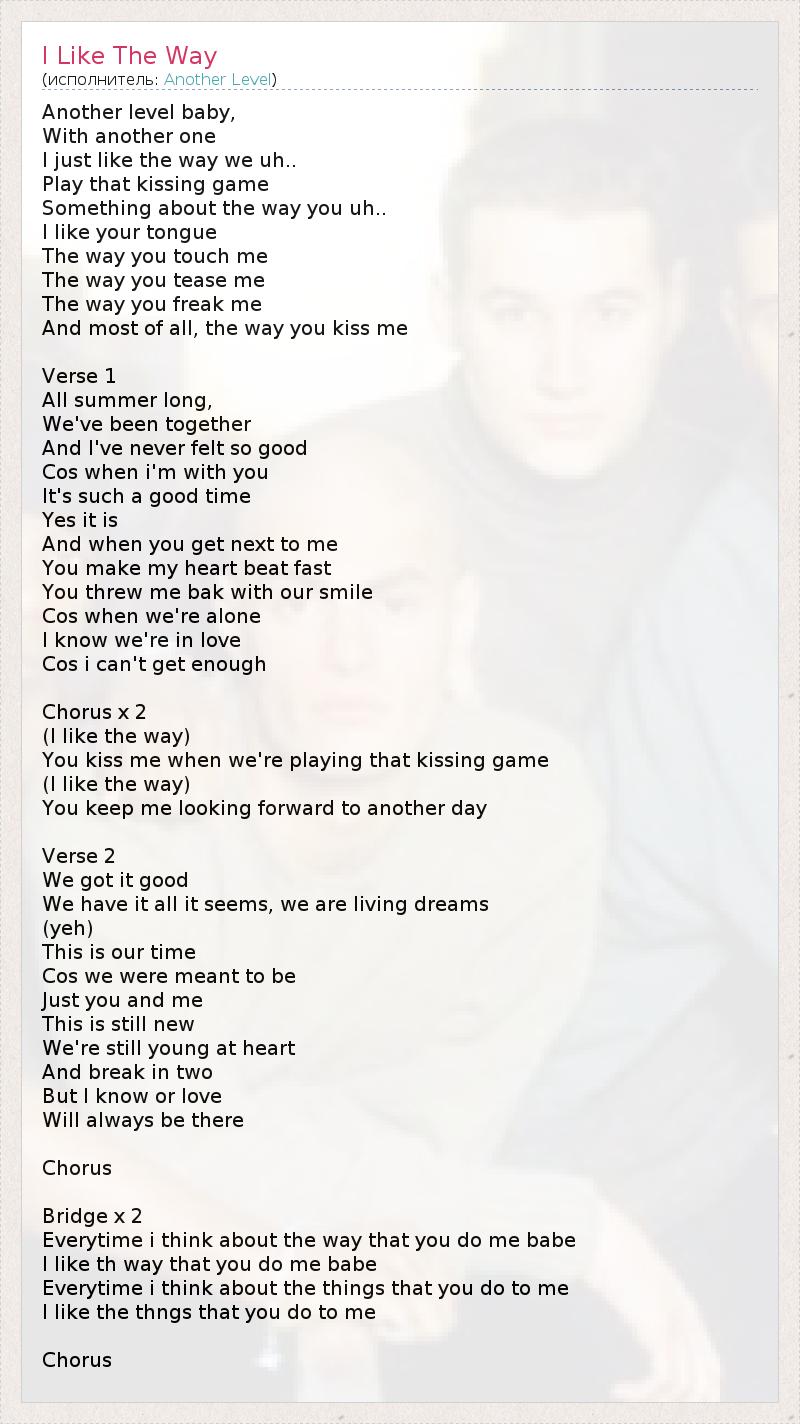 Another level baby, With another one I just like the way we uh.. Play that kissing game Something about the way you uh.. I like your tongue The way you touch me The way you tease me The way you freak me And most of all, the way you kiss me Verse 1 All summer long, We've been together And I've never felt so good Cos when i'm with you It's such a good time Yes it is And when you get next to me You make my heart beat fast You threw me bak with our smile Cos when we're alone I know we're in love Cos i can't get enough Chorus x 2 (I like the way) You kiss me when we're playing that kissing game (I like the way) You keep me looking forward to another day Verse 2 We got it good We have it all it seems, we are living dreams (yeh) This is our time Cos we were meant to be Just you and me This is still new We're still young at heart And break in two But I know or love Will always be there Chorus Bridge x 2 Everytime i think about the way that you do me babe I like th way that you do me babe Everytime i think about the things that you do to me I like the thngs that you do to me Chorus