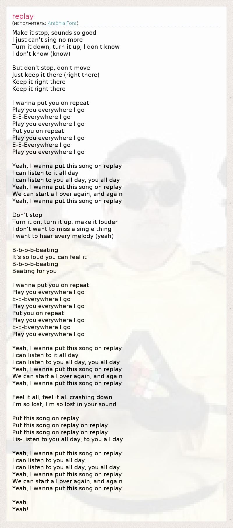 Останови эту красивую песню, Я просто не могу больше петь. Убавь звук, прибавь громкость, я не знаю, Я не знаю... Но не останавливайся, не уходи, Просто будь здесь (здесь) Останься здесь, Останься здесь. Я хочу поставить тебя на повтор, Слушать везде, где бы я ни была, Ку-куда бы я ни пошла, Слушать везде, где бы я ни была. Поставить тебя на повтор. Слушать везде, где бы я ни была, Ку-куда бы я ни пошла, Слушать везде, где бы я ни была. Да, я хочу поставить эту песню на повтор, Я могу слушать её целый день, Я могу слушать тебя целый день, тебя целый день. Да, я хочу поставить эту песню на повтор, Мы можем начать всё сначала, сначала. Да, я хочу поставить эту песню на повтор. Не останавливайся, Включи ее, перемотай ее, прибавь громкость. Я не хочу ничего упустить, Я хочу услышать каждую ноту. (Да) Б-б-ит, Он такой звучный, почувствуй его. Б-б-ит, Он звучит для тебя! Я хочу поставить тебя на повтор, Слушать везде, где бы я ни была, Ку-куда бы я ни пошла, Слушать везде, где бы я ни была. Поставить тебя на повтор. Слушать везде, где бы я ни была, Ку-куда бы я ни пошла, Слушать везде, где бы я ни была. Да, я хочу поставить эту песню на повтор, Я могу слушать её целый день, Я могу слушать тебя целый день, тебя целый день. Да, я хочу поставить эту песню на повтор, Мы можем начать всё сначала, сначала. Да, я хочу поставить эту песню на повтор. Я чувствую, как всё рушится, Я потерялась, полностью растворилась в твоём звуке... Поставь эту песню на повтор, Поставь эту песню на повтор, на повтор Поставь эту песню на повтор, на повтор, С-слушать тебя целый день, тебя целый день. Да, я хочу поставить эту песню на повтор, Я хочу слушать тебя целый день, Я слушать тебя целый день, тебя целый день. Да, я хочу поставить эту песню на повтор, Мы можем начать всё сначала, сначала. Да, я хочу поставить эту песню на повтор. Да, Да!