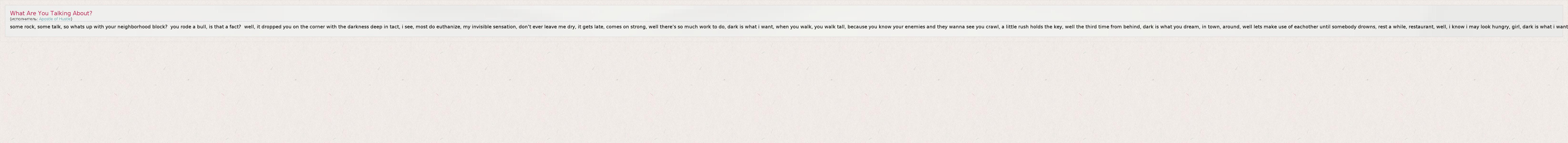 some rock, some talk, so whats up with your neighborhood block?  you rode a bull, is that a fact?  well, it dropped you on the corner with the darkness deep in tact, i see, most do euthanize, my invisible sensation, don't ever leave me dry, it gets late, comes on strong, well there's so much work to do, dark is what i want, when you walk, you walk tall, because you know your enemies and they wanna see you crawl, a little rush holds the key, well the third time from behind, dark is what you dream, in town, around, well lets make use of eachother until somebody drowns, rest a while, restaurant, well, i know i may look hungry, girl, dark is what i want