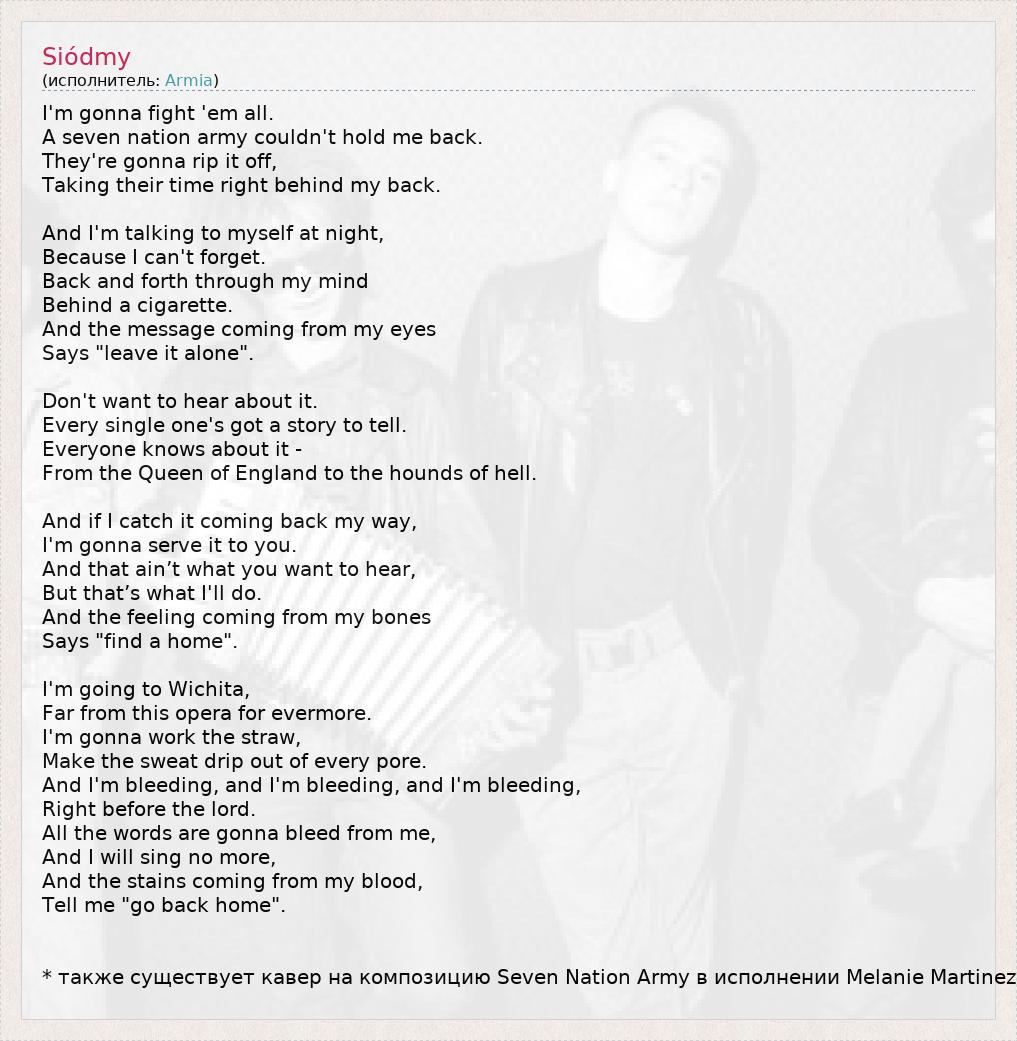 I'm gonna fight 'em all. A seven nation army couldn't hold me back. They're gonna rip it off, Taking their time right behind my back. And I'm talking to myself at night, Because I can't forget. Back and forth through my mind Behind a cigarette. And the message coming from my eyes Says "leave it alone". Don't want to hear about it. Every single one's got a story to tell. Everyone knows about it - From the Queen of England to the hounds of hell. And if I catch it coming back my way, I'm gonna serve it to you. And that ain’t what you want to hear, But that’s what I'll do. And the feeling coming from my bones Says "find a home". I'm going to Wichita, Far from this opera for evermore. I'm gonna work the straw, Make the sweat drip out of every pore. And I'm bleeding, and I'm bleeding, and I'm bleeding, Right before the lord. All the words are gonna bleed from me, And I will sing no more, And the stains coming from my blood, Tell me "go back home". * также существует кавер на композицию Seven Nation Army в исполнении Melanie Martinez