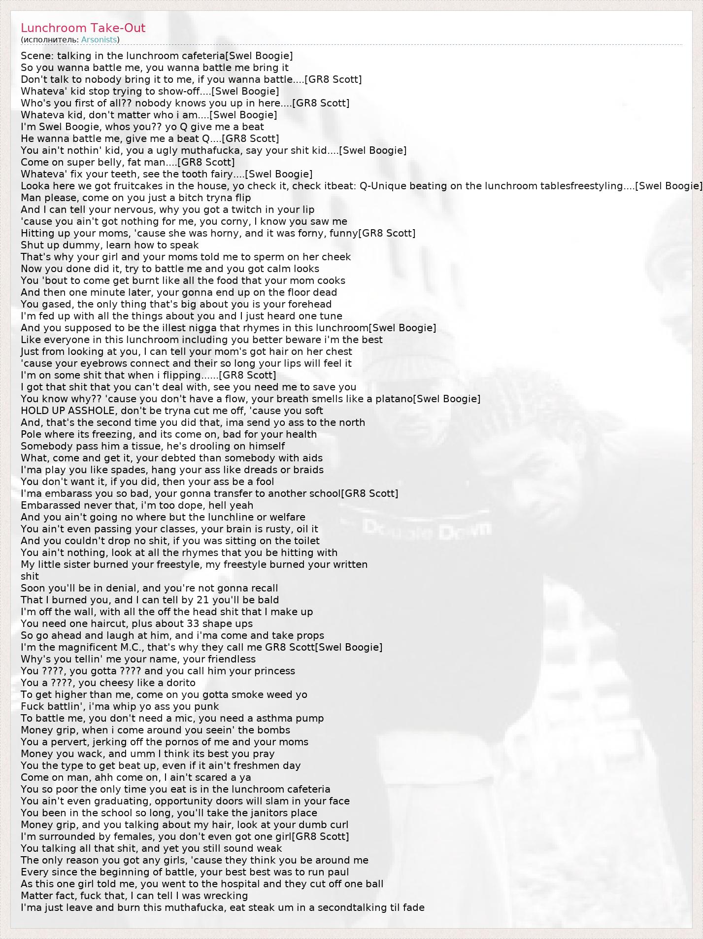 А как ты думаешь, о чем песня "Lunchroom Take-Out" ?