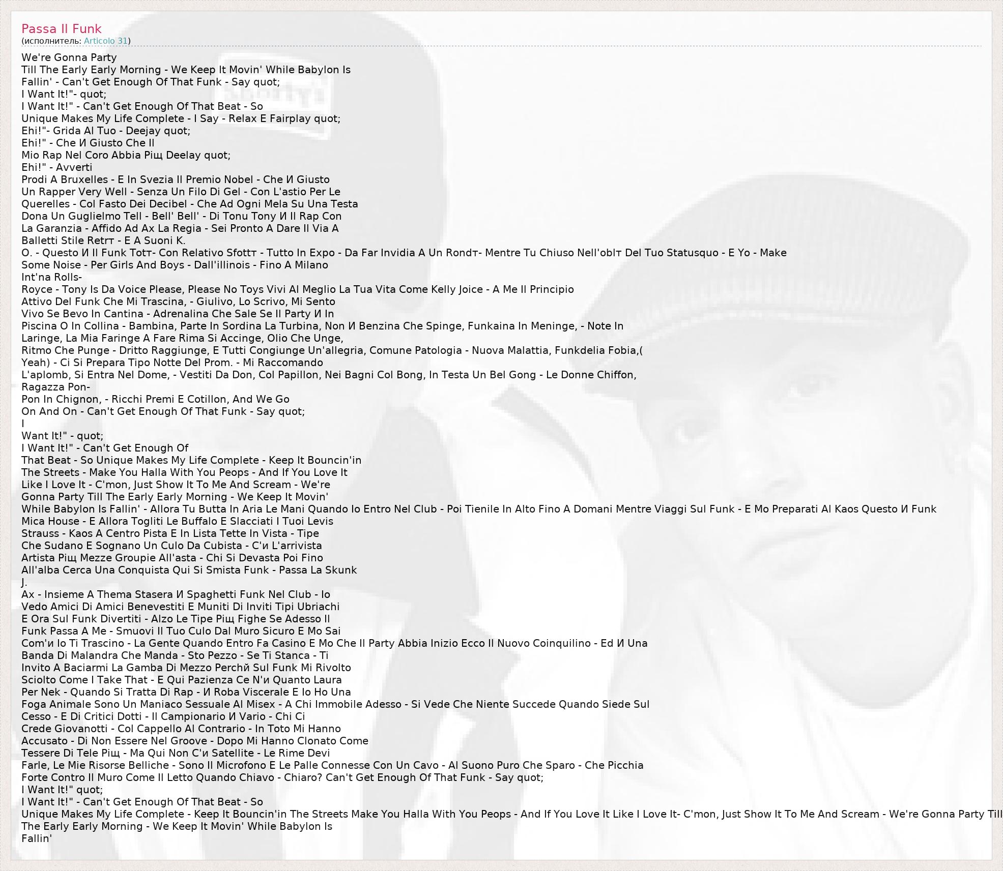 We're Gonna Party Till The Early Early Morning - We Keep It Movin' While Babylon Is Fallin' - Can't Get Enough Of That Funk - Say quot; I Want It!"- quot; I Want It!" - Can't Get Enough Of That Beat - So Unique Makes My Life Complete - I Say - Relax E Fairplay quot; Ehi!"- Grida Al Tuo - Deejay quot; Ehi!" - Che И Giusto Che Il Mio Rap Nel Coro Abbia Piщ Deelay quot; Ehi!" - Avverti Prodi A Bruxelles - E In Svezia Il Premio Nobel - Che И Giusto Un Rapper Very Well - Senza Un Filo Di Gel - Con L'astio Per Le Querelles - Col Fasto Dei Decibel - Che Ad Ogni Mela Su Una Testa Dona Un Guglielmo Tell - Bell' Bell' - Di Tonu Tony И Il Rap Con La Garanzia - Affido Ad Ax La Regia - Sei Pronto A Dare Il Via A Balletti Stile Retrт - E A Suoni K. O. - Questo И Il Funk Totт- Con Relativo Sfottт - Tutto In Expo - Da Far Invidia A Un Rondт- Mentre Tu Chiuso Nell'oblт Del Tuo Statusquo - E Yo - Make Some Noise - Per Girls And Boys - Dall'illinois - Fino A Milano Int'na Rolls- Royce - Tony Is Da Voice Please, Please No Toys Vivi Al Meglio La Tua Vita Come Kelly Joice - A Me Il Principio Attivo Del Funk Che Mi Trascina, - Giulivo, Lo Scrivo, Mi Sento Vivo Se Bevo In Cantina - Adrenalina Che Sale Se Il Party И In Piscina O In Collina - Bambina, Parte In Sordina La Turbina, Non И Benzina Che Spinge, Funkaina In Meninge, - Note In Laringe, La Mia Faringe A Fare Rima Si Accinge, Olio Che Unge, Ritmo Che Punge - Dritto Raggiunge, E Tutti Congiunge Un'allegria, Comune Patologia - Nuova Malattia, Funkdelia Fobia,( Yeah) - Ci Si Prepara Tipo Notte Del Prom. - Mi Raccomando L'aplomb, Si Entra Nel Dome, - Vestiti Da Don, Col Papillon, Nei Bagni Col Bong, In Testa Un Bel Gong - Le Donne Chiffon, Ragazza Pon- Pon In Chignon, - Ricchi Premi E Cotillon, And We Go On And On - Can't Get Enough Of That Funk - Say quot; I Want It!" - quot; I Want It!" - Can't Get Enough Of That Beat - So Unique Makes My Life Complete - Keep It Bouncin'in The Streets - Make You Halla With You Peops - And If You Love It Like I Love It - C'mon, Just Show It To Me And Scream - We're Gonna Party Till The Early Early Morning - We Keep It Movin' While Babylon Is Fallin' - Allora Tu Butta In Aria Le Mani Quando Io Entro Nel Club - Poi Tienile In Alto Fino A Domani Mentre Viaggi Sul Funk - E Mo Preparati Al Kaos Questo И Funk Mica House - E Allora Togliti Le Buffalo E Slacciati I Tuoi Levis Strauss - Kaos A Centro Pista E In Lista Tette In Vista - Tipe Che Sudano E Sognano Un Culo Da Cubista - C'и L'arrivista Artista Piщ Mezze Groupie All'asta - Chi Si Devasta Poi Fino All'alba Cerca Una Conquista Qui Si Smista Funk - Passa La Skunk J. Ax - Insieme A Thema Stasera И Spaghetti Funk Nel Club - Io Vedo Amici Di Amici Benevestiti E Muniti Di Inviti Tipi Ubriachi E Ora Sul Funk Divertiti - Alzo Le Tipe Piщ Fighe Se Adesso Il Funk Passa A Me - Smuovi Il Tuo Culo Dal Muro Sicuro E Mo Sai Com'и Io Ti Trascino - La Gente Quando Entro Fa Casino E Mo Che Il Party Abbia Inizio Ecco Il Nuovo Coinquilino - Ed И Una Banda Di Malandra Che Manda - Sto Pezzo - Se Ti Stanca - Ti Invito A Baciarmi La Gamba Di Mezzo Perchй Sul Funk Mi Rivolto Sciolto Come I Take That - E Qui Pazienza Ce N'и Quanto Laura Per Nek - Quando Si Tratta Di Rap - И Roba Viscerale E Io Ho Una Foga Animale Sono Un Maniaco Sessuale Al Misex - A Chi Immobile Adesso - Si Vede Che Niente Succede Quando Siede Sul Cesso - E Di Critici Dotti - Il Campionario И Vario - Chi Ci Crede Giovanotti - Col Cappello Al Contrario - In Toto Mi Hanno Accusato - Di Non Essere Nel Groove - Dopo Mi Hanno Clonato Come Tessere Di Tele Piщ - Ma Qui Non C'и Satellite - Le Rime Devi Farle, Le Mie Risorse Belliche - Sono Il Microfono E Le Palle Connesse Con Un Cavo - Al Suono Puro Che Sparo - Che Picchia Forte Contro Il Muro Come Il Letto Quando Chiavo - Chiaro? Can't Get Enough Of That Funk - Say quot; I Want It!" quot; I Want It!" - Can't Get Enough Of That Beat - So Unique Makes My Life Complete - Keep It Bouncin'in The Streets Make You Halla With You Peops - And If You Love It Like I Love It- C'mon, Just Show It To Me And Scream - We're Gonna Party Till The Early Early Morning - We Keep It Movin' While Babylon Is Fallin'