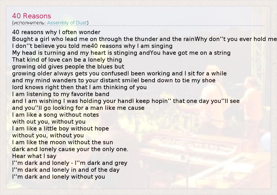А как ты думаешь, о чем песня "40 Reasons" ?