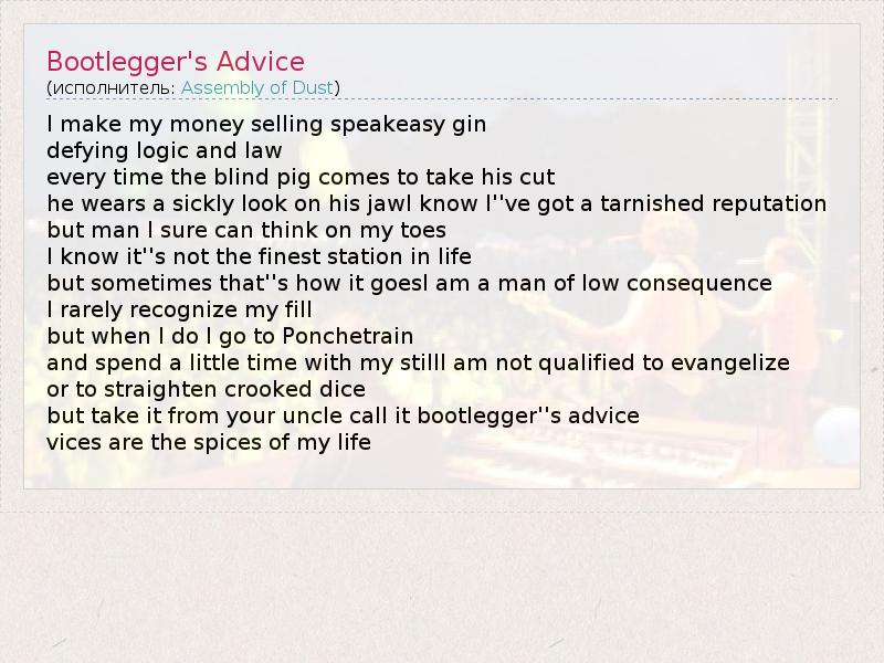 А как ты думаешь, о чем песня "Bootlegger's Advice" ?