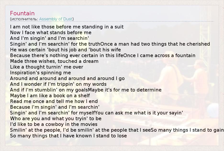 I am not like those before me standing in a suit Now I face what stands before me And I'm singin' and I'm searchin' Singin' and I'm searchin' for the truthOnce a man had two things that he cherished He was certain 'bout his job and 'bout his wife Because there's nothing ever certain in this lifeOnce I came across a fountain Made three wishes, touched a dream Like a thought turnin' me over Inspiration's spinning me Around and around and around and around I go And I wonder if I'm trippin' on my words And if I'm stumblin' on my goalsMaybe it's for me to determine Maybe I am like a book on a shelf Read me once and tell me how I end Because I'm singin' and I'm searchin' Singin' and I'm searchin' for myselfYou can ask me what is it your sayin' Who are you and what you tryin' to be I'd like to be a cowboy in the movies Smilin' at the people, I'd be smilin' at the people that I seeSo many things I stand to gain So many things that I have known I stand to lose