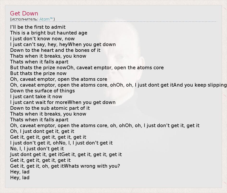 I'll be the first to admit This is a bright but haunted age I just don't know now, now I just can't say, hey, heyWhen you get down Down to the heart and the bones of it Thats when it breaks, you know Thats when it falls apart But thats the prize nowOh, caveat emptor, open the atoms core But thats the prize now Oh, caveat emptor, open the atoms core Oh, caveat emptor, open the atoms core, ohOh, oh, I just dont get itAnd you keep slipping Down the surface of things I just cant take it now I just cant wait for moreWhen you get down Down to the sub atomic part of it Thats when it breaks, you know Thats when it falls apart Oh, caveat emptor, open the atoms core, oh, ohOh, oh, I just don't get it, get it Oh, I just dont get it, get it Get it, get it, get it, get it, get it I just don't get it, ohNo, I, I just don't get it No, I, I just don't get it Just dont get it, get itGet it, get it, get it, get it Get it, get it, get it, get it Get it, get it, oh, get itWhats wrong with you? Hey, lad Hey, lad