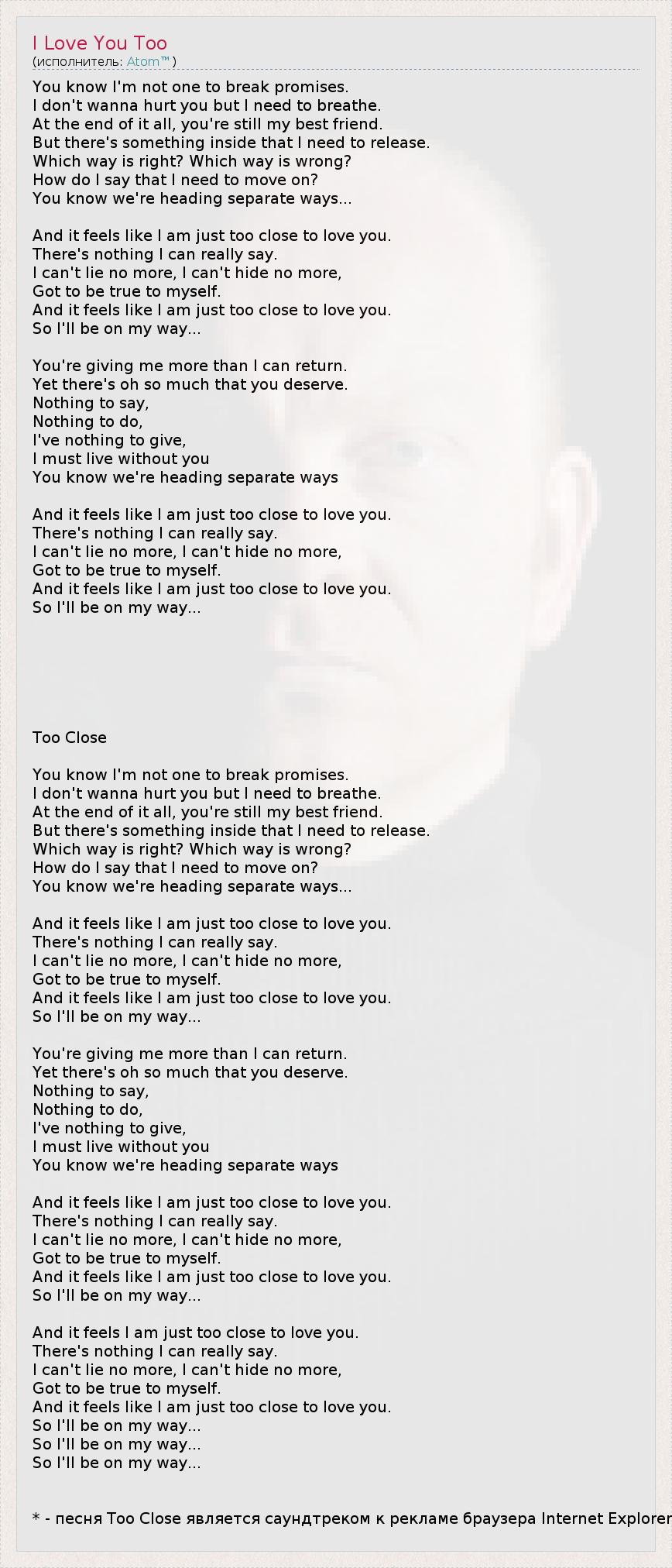 You know I'm not one to break promises. I don't wanna hurt you but I need to breathe. At the end of it all, you're still my best friend. But there's something inside that I need to release. Which way is right? Which way is wrong? How do I say that I need to move on? You know we're heading separate ways... And it feels like I am just too close to love you. There's nothing I can really say. I can't lie no more, I can't hide no more, Got to be true to myself. And it feels like I am just too close to love you. So I'll be on my way... You're giving me more than I can return. Yet there's oh so much that you deserve. Nothing to say, Nothing to do, I've nothing to give, I must live without you You know we're heading separate ways And it feels like I am just too close to love you. There's nothing I can really say. I can't lie no more, I can't hide no more, Got to be true to myself. And it feels like I am just too close to love you. So I'll be on my way... Too Close You know I'm not one to break promises. I don't wanna hurt you but I need to breathe. At the end of it all, you're still my best friend. But there's something inside that I need to release. Which way is right? Which way is wrong? How do I say that I need to move on? You know we're heading separate ways... And it feels like I am just too close to love you. There's nothing I can really say. I can't lie no more, I can't hide no more, Got to be true to myself. And it feels like I am just too close to love you. So I'll be on my way... You're giving me more than I can return. Yet there's oh so much that you deserve. Nothing to say, Nothing to do, I've nothing to give, I must live without you You know we're heading separate ways And it feels like I am just too close to love you. There's nothing I can really say. I can't lie no more, I can't hide no more, Got to be true to myself. And it feels like I am just too close to love you. So I'll be on my way... And it feels I am just too close to love you. There's nothing I can really say. I can't lie no more, I can't hide no more, Got to be true to myself. And it feels like I am just too close to love you. So I'll be on my way... So I'll be on my way... So I'll be on my way... * - песня Too Close является саyндтреком к рекламе браузера Internet Explorer