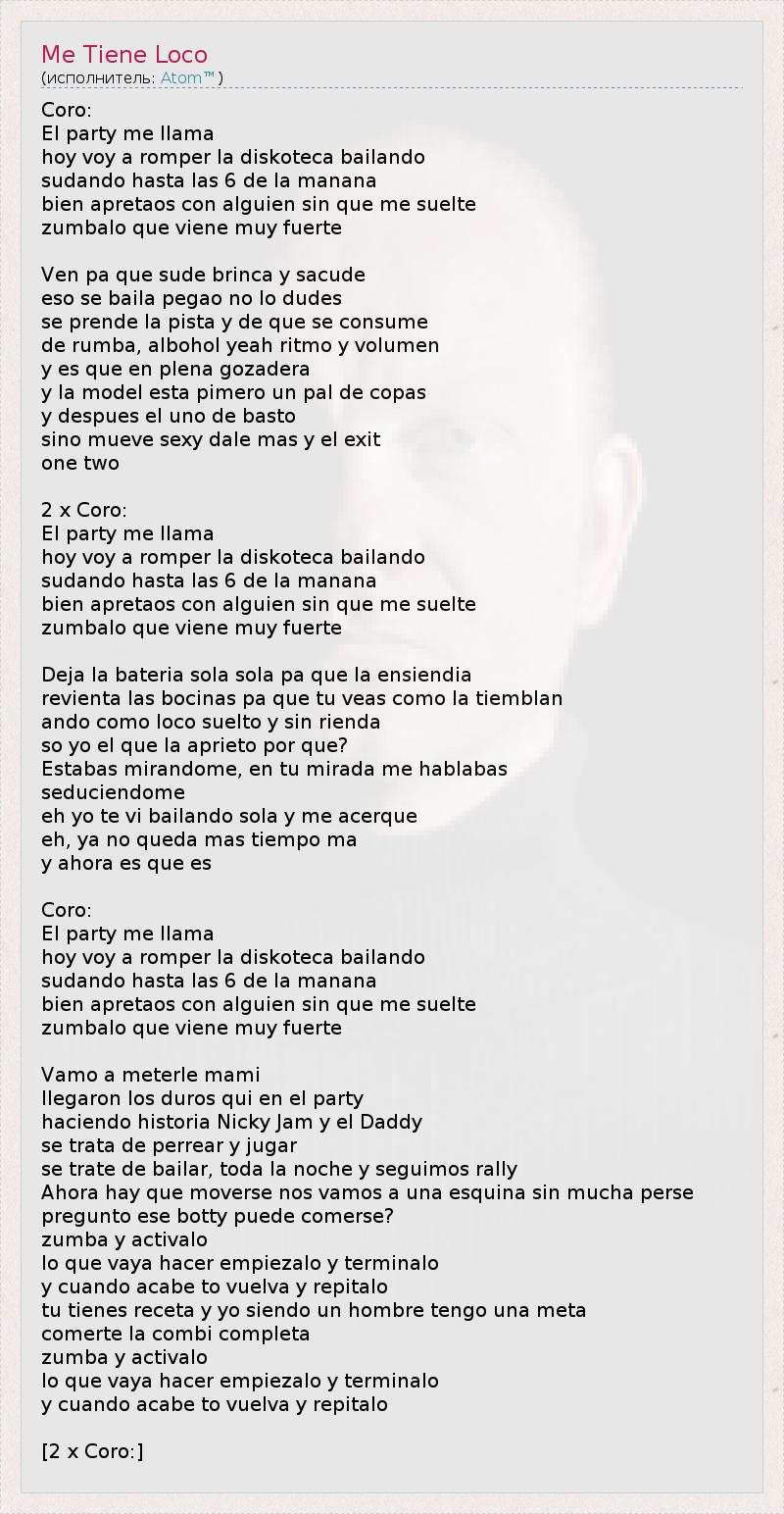 Коро : Эль партия меня ламы хой Voyползунки ла diskoteca Bailando sudando хаста лас 6 -де-ла Манана Bien apretaos кон alguien грех Que меня suelte zumbalo Que Viene Muy Fuerte Вен годовых Que Sude Brinca у sacude ESO себе Baila pegao время не LO чуваков себе prende ла Пишта у де Que себе потреблять де румба , albohol да ритмо у Volumen у эс Que ан Plena gozadera у ла модель Эста Pimero ООН приятель де Copas у despues эль UNO де Basto Китайско Mueve сексуальная Дейла ичные у эль выход один два 2 х Коро : Эль партия меня ламы хой Voyползунки ла diskoteca Bailando sudando хаста лас 6 -де-ла Манана Bien apretaos кон alguien грех Que меня suelte zumbalo Que Viene Muy Fuerte Deja Ла Батерия Сола Сола годовых Que ла ensiendia revienta Лас bocinas годовых Que Tu veas Комо ла tiemblan Андо Комо локо suelto у грех rienda так лет эль Que ла aprieto POR Que ? Estabas mirandome , ан ту Mirada меня hablabas seduciendome Эх лет те VI Bailando Sola у меня acerque Эх , я не Каида Рождество Tiempo ма у Ahora эс Que эс Коро : Эль партия меня ламы хой Voyползунки ла diskoteca Bailando sudando хаста лас 6 -де-ла Манана Bien apretaos кон alguien грех Que меня suelte zumbalo Que Viene Muy Fuerte Vamometerle Мами llegaron лос Duros Квай ан -эль- вечеринка Haciendo Historia Ники Jam у эль Папа себе Trata де perrear у Jugar себе рация де Bailar , тода ла Noche у seguimos митинг Ahora сено Que moverse NOS Vamosуна Эскина грех Муха серовато-синий pregunto ЮВ botty Puede comerse ? Zumba у activalo вот дие вая Hacer empiezalo у terminalo у Cuando acabe в Vuelva у repitalo Ту Tienes receta у йо siendo ип Hombre Тенго уна мета comerte ла комби Completa Zumba у activalo вот дие вая Hacer empiezalo у terminalo у Cuando acabe в Vuelva у repitalo [ 2 х Коро : ]