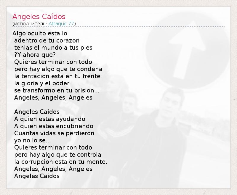 Algo oculto estallo adentro de tu corazon tenias el mundo a tus pies ?Y ahora que? Quieres terminar con todo pero hay algo que te condena la tentacion esta en tu frente la gloria y el poder se transformo en tu prision... Angeles, Angeles, Angeles Angeles Caidos A quien estas ayudando A quien estas encubriendo Cuantas vidas se perdieron yo no lo se... Quieres terminar con todo pero hay algo que te controla la corrupcion esta en tu mente. Angeles, Angeles, Angeles Angeles Caidos