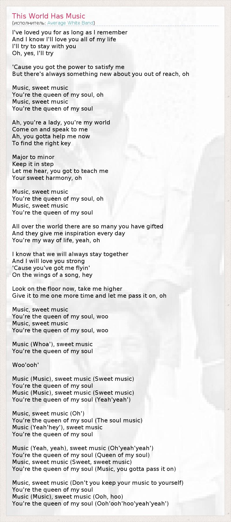 I've loved you for as long as I remember And I know I'll love you all of my life I'll try to stay with you Oh, yes, I'll try 'Cause you got the power to satisfy me But there's always something new about you out of reach, oh Music, sweet music You're the queen of my soul, oh Music, sweet music You're the queen of my soul Ah, you're a lady, you're my world Come on and speak to me Ah, you gotta help me now To find the right key Major to minor Keep it in step Let me hear, you got to teach me Your sweet harmony, oh Music, sweet music You're the queen of my soul, oh Music, sweet music You're the queen of my soul All over the world there are so many you have gifted And they give me inspiration every day You're my way of life, yeah, oh I know that we will always stay together And I will love you strong 'Cause you've got me flyin' On the wings of a song, hey Look on the floor now, take me higher Give it to me one more time and let me pass it on, oh Music, sweet music You're the queen of my soul, woo Music, sweet music You're the queen of my soul, woo Music (Whoa'), sweet music You're the queen of my soul Woo'ooh' Music (Music), sweet music (Sweet music) You're the queen of my soul Music (Music), sweet music (Sweet music) You're the queen of my soul (Yeah'yeah') Music, sweet music (Oh') You're the queen of my soul (The soul music) Music (Yeah'hey'), sweet music You're the queen of my soul Music (Yeah, yeah), sweet music (Oh'yeah'yeah') You're the queen of my soul (Queen of my soul) Music, sweet music (Sweet, sweet music) You're the queen of my soul (Music, you gotta pass it on) Music, sweet music (Don't you keep your music to yourself) You're the queen of my soul Music (Music), sweet music (Ooh, hoo) You're the queen of my soul (Ooh'ooh'hoo'yeah'yeah')