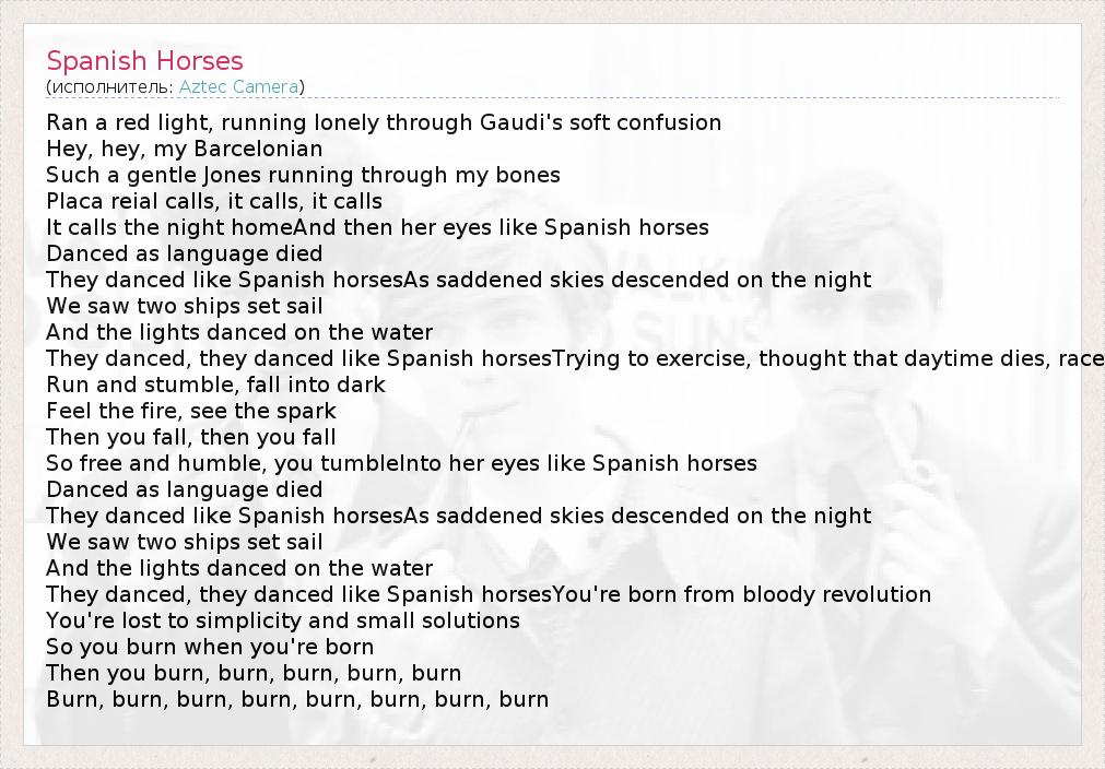 Ran a red light, running lonely through Gaudi's soft confusion Hey, hey, my Barcelonian Such a gentle Jones running through my bones Placa reial calls, it calls, it calls It calls the night homeAnd then her eyes like Spanish horses Danced as language died They danced like Spanish horsesAs saddened skies descended on the night We saw two ships set sail And the lights danced on the water They danced, they danced like Spanish horsesTrying to exercise, thought that daytime dies, race Run and stumble, fall into dark Feel the fire, see the spark Then you fall, then you fall So free and humble, you tumbleInto her eyes like Spanish horses Danced as language died They danced like Spanish horsesAs saddened skies descended on the night We saw two ships set sail And the lights danced on the water They danced, they danced like Spanish horsesYou're born from bloody revolution You're lost to simplicity and small solutions So you burn when you're born Then you burn, burn, burn, burn, burn Burn, burn, burn, burn, burn, burn, burn, burn