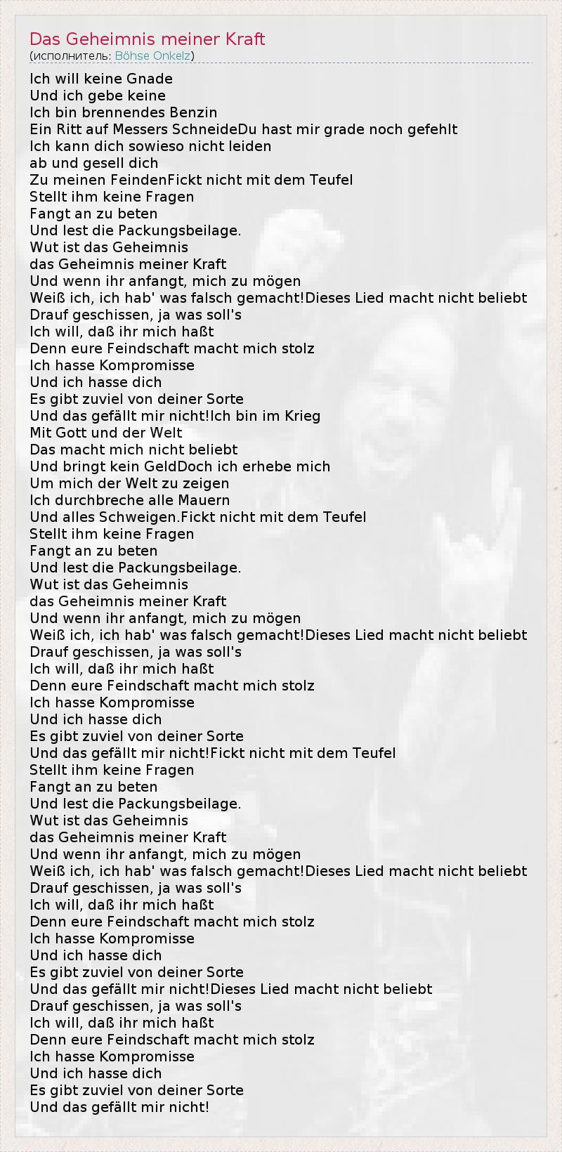 Ich will keine Gnade Und ich gebe keine Ich bin brennendes Benzin Ein Ritt auf Messers SchneideDu hast mir grade noch gefehlt Ich kann dich sowieso nicht leiden ab und gesell dich Zu meinen FeindenFickt nicht mit dem Teufel Stellt ihm keine Fragen Fangt an zu beten Und lest die Packungsbeilage. Wut ist das Geheimnis das Geheimnis meiner Kraft Und wenn ihr anfangt, mich zu mögen Weiß ich, ich hab' was falsch gemacht!Dieses Lied macht nicht beliebt Drauf geschissen, ja was soll's Ich will, daß ihr mich haßt Denn eure Feindschaft macht mich stolz Ich hasse Kompromisse Und ich hasse dich Es gibt zuviel von deiner Sorte Und das gefällt mir nicht!Ich bin im Krieg Mit Gott und der Welt Das macht mich nicht beliebt Und bringt kein GeldDoch ich erhebe mich Um mich der Welt zu zeigen Ich durchbreche alle Mauern Und alles Schweigen.Fickt nicht mit dem Teufel Stellt ihm keine Fragen Fangt an zu beten Und lest die Packungsbeilage. Wut ist das Geheimnis das Geheimnis meiner Kraft Und wenn ihr anfangt, mich zu mögen Weiß ich, ich hab' was falsch gemacht!Dieses Lied macht nicht beliebt Drauf geschissen, ja was soll's Ich will, daß ihr mich haßt Denn eure Feindschaft macht mich stolz Ich hasse Kompromisse Und ich hasse dich Es gibt zuviel von deiner Sorte Und das gefällt mir nicht!Fickt nicht mit dem Teufel Stellt ihm keine Fragen Fangt an zu beten Und lest die Packungsbeilage. Wut ist das Geheimnis das Geheimnis meiner Kraft Und wenn ihr anfangt, mich zu mögen Weiß ich, ich hab' was falsch gemacht!Dieses Lied macht nicht beliebt Drauf geschissen, ja was soll's Ich will, daß ihr mich haßt Denn eure Feindschaft macht mich stolz Ich hasse Kompromisse Und ich hasse dich Es gibt zuviel von deiner Sorte Und das gefällt mir nicht!Dieses Lied macht nicht beliebt Drauf geschissen, ja was soll's Ich will, daß ihr mich haßt Denn eure Feindschaft macht mich stolz Ich hasse Kompromisse Und ich hasse dich Es gibt zuviel von deiner Sorte Und das gefällt mir nicht!