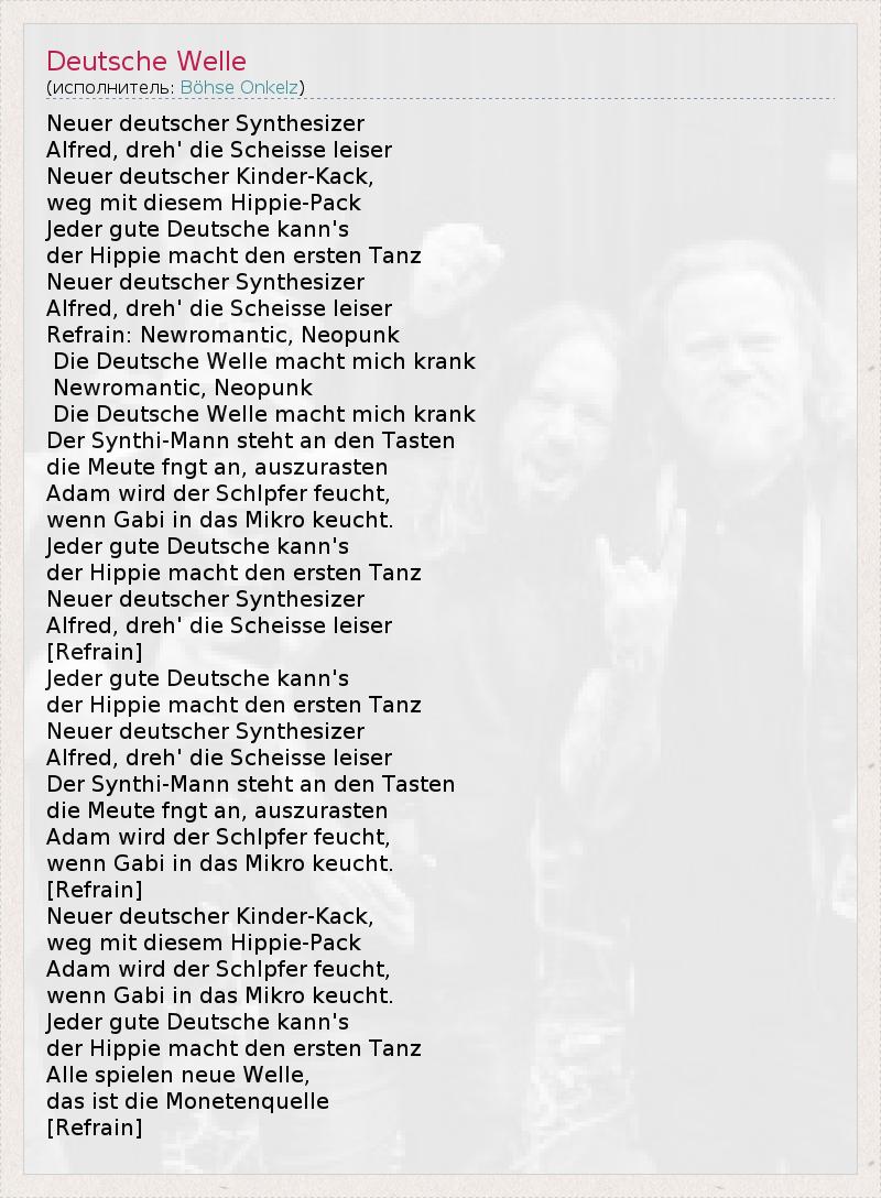 Neuer deutscher Synthesizer Alfred, dreh' die Scheisse leiser Neuer deutscher Kinder-Kack, weg mit diesem Hippie-Pack Jeder gute Deutsche kann's der Hippie macht den ersten Tanz Neuer deutscher Synthesizer Alfred, dreh' die Scheisse leiser Refrain: Newromantic, Neopunk Die Deutsche Welle macht mich krank Newromantic, Neopunk Die Deutsche Welle macht mich krank Der Synthi-Mann steht an den Tasten die Meute fngt an, auszurasten Adam wird der Schlpfer feucht, wenn Gabi in das Mikro keucht. Jeder gute Deutsche kann's der Hippie macht den ersten Tanz Neuer deutscher Synthesizer Alfred, dreh' die Scheisse leiser [Refrain] Jeder gute Deutsche kann's der Hippie macht den ersten Tanz Neuer deutscher Synthesizer Alfred, dreh' die Scheisse leiser Der Synthi-Mann steht an den Tasten die Meute fngt an, auszurasten Adam wird der Schlpfer feucht, wenn Gabi in das Mikro keucht. [Refrain] Neuer deutscher Kinder-Kack, weg mit diesem Hippie-Pack Adam wird der Schlpfer feucht, wenn Gabi in das Mikro keucht. Jeder gute Deutsche kann's der Hippie macht den ersten Tanz Alle spielen neue Welle, das ist die Monetenquelle [Refrain]