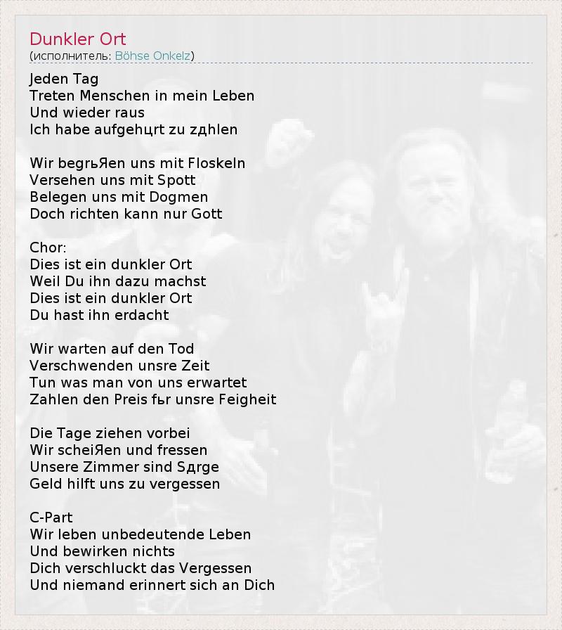 Jeden Tag Treten Menschen in mein Leben Und wieder raus Ich habe aufgehцrt zu zдhlen Wir begrьЯen uns mit Floskeln Versehen uns mit Spott Belegen uns mit Dogmen Doch richten kann nur Gott Chor: Dies ist ein dunkler Ort Weil Du ihn dazu machst Dies ist ein dunkler Ort Du hast ihn erdacht Wir warten auf den Tod Verschwenden unsre Zeit Tun was man von uns erwartet Zahlen den Preis fьr unsre Feigheit Die Tage ziehen vorbei Wir scheiЯen und fressen Unsere Zimmer sind Sдrge Geld hilft uns zu vergessen C-Part Wir leben unbedeutende Leben Und bewirken nichts Dich verschluckt das Vergessen Und niemand erinnert sich an Dich